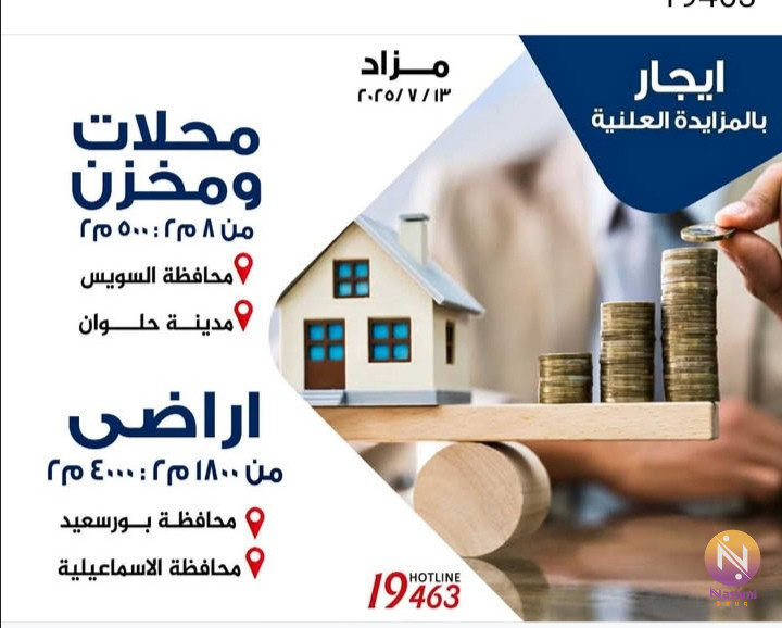جلسة مــزاد الأحـــــــد الموافق 13 / 7 / 2025 الشركـــة القابضـــة للصناعـات الغذائيـة تعلن عــن #تأجير بالمزايدة العلنية لصالح شركة تسويق الأرز ============================= أولا/ محافظة #السويس - عدد 3 #محلات بمساحة 15 م2 للمحل - مكتب #اداري بمساحة 120 م2 - #مخـزن بمساحة 500 م2 كائنة بمنطقـــــة المثلث طريــق الإسماعيلية / السويس - المنطقة الصناعية القديمة ثانيا/ محافظة #بورسعيد مستـودع القابوطــــــي بمساحـــــة 1800 م2 تقريبـــــــا الكائن بمنطقة القابوطي بجوار مصنع الثلج ثالثا/ محافظة #الاسماعيلية #أرض فضاء بمساحة 4000 م2 كــــائنة بمركـــــز تعبئــــة الإسماعيليــــة المنطقــــة الصناعيــــة بجــوار المطافـي رابعا/ #حلوان - القاهرة عدد 5 #محلات بالدور الأرضي بمساحـــــــة 8 م2 للمحـــــــــــــل #محل بالدور الأول علوي بمساحــــــة 32 م2 تقريبــــــــــــا كــــــــائنة بعزبـــــة الوالــــــــــــــــــدة #محلات #محل #مخازن #مخزن #مكتب #تجاري #اداري #ارض #عقار #عقارات #إيجار #استثمار #فرصة =================================== للاستفسار سجل بياناتك او اتصل على : 01009990009 19463