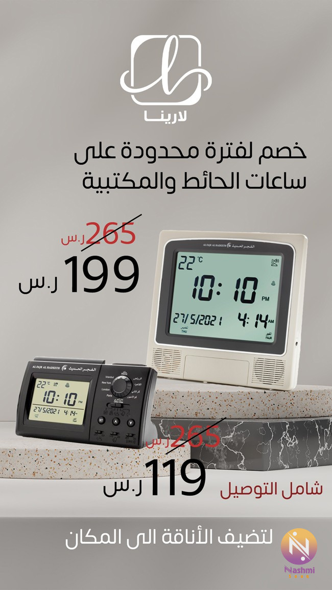 عرض لفترة محدودة ساعة الفجر جدارية حائط او طاولة المميزات - أوقات الأذان لجميع مُدن العالم - اذان لجميع الصلوات الخمس - منبه يومي - امكانيه وضعها ع استند طاوله او جداريه - تقويم هجري وميلادي - إتجاه القبله من الشمال -المقاس ( 23سم * 22سم ) - ضمان سنتين من شركة ساعة الفجر الحديث - والسعر اقل من سعر السوق المحلي السعر 199ريال الحائط الكبير 119 ريال الطاولة الصغير كما اننا نوفر تشكيلة واسعة من الساعات اليدوية رجالية ونسائية ( شامل الشحن والتوصيل لجدة او خارج جدة) للطلب والتواصل مباشره https://api.whatsapp.com/send/?phone=966554012853&text&type=phone_number&app_abs ent=0 وللطلب من خلال متجر لارينا : https://laarina.com/