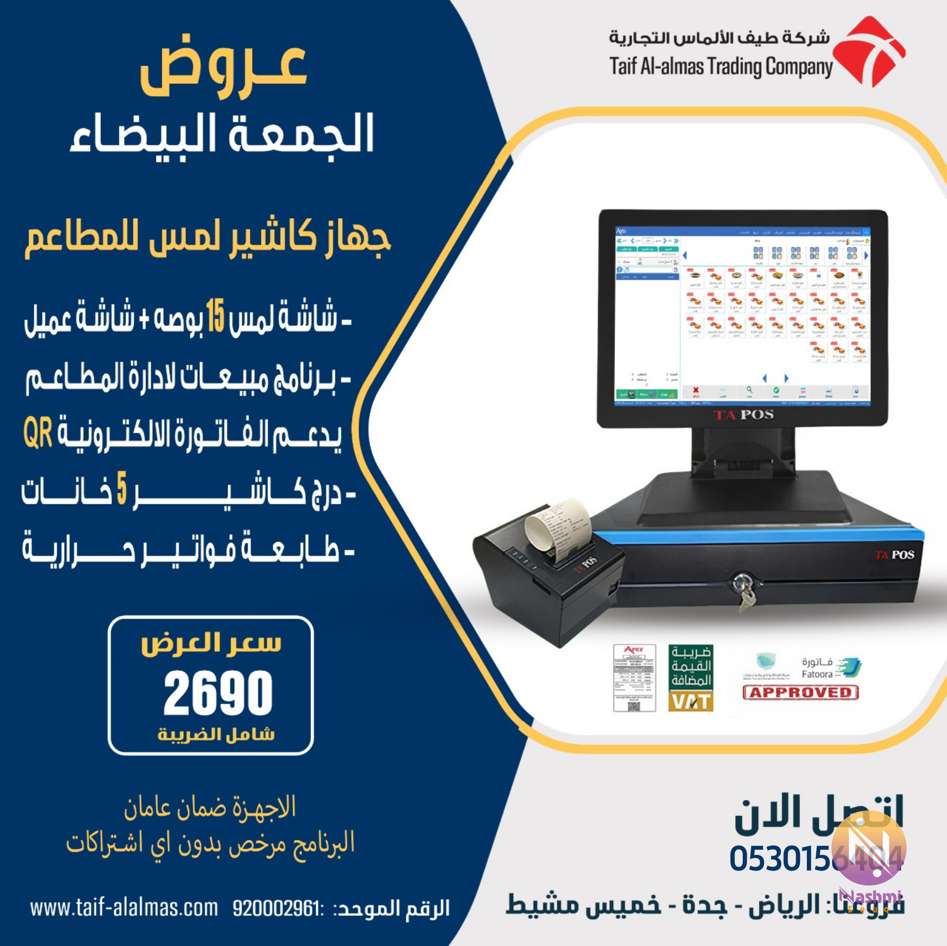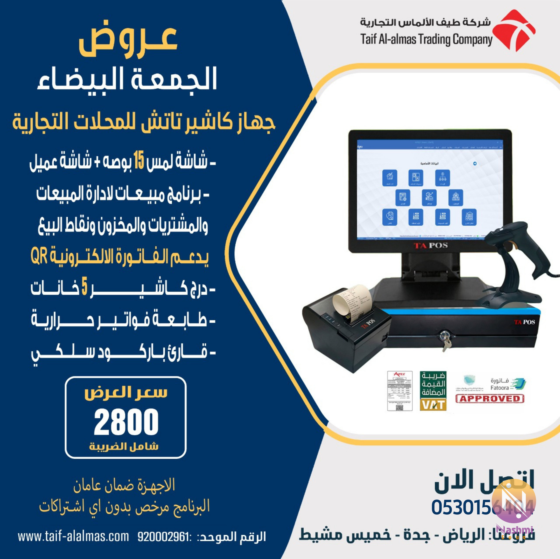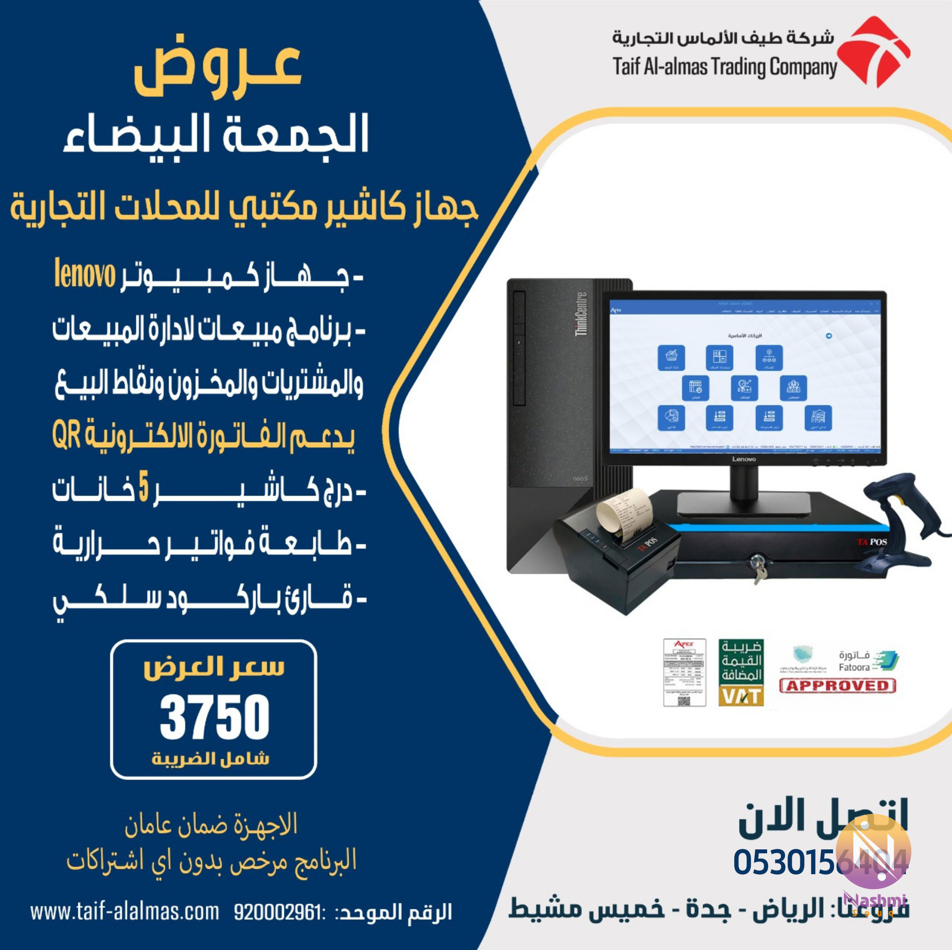 عروض الجمعة البيضاء من شركة طيف الالماس خاص ولفتره محدودة علي( كاميرات-اكسس-بصمة موظفين-انتركم-انذار سرقات-سنترالات-اجهزة تتبع سيارات بوابات مرور افراد-بوابات سيارات-بوابات كشف معادن-برامج ادارية ومحاسبيه ) العرض الاول انظمة كاشير للمطاعم والكافي شوب والمحلات التجارية يدعم الفاتوره الالكترونية سيستم كاشير كامل الاجهزة مع برنامج مبيعات ومشتريات والمخازن بواجهة برنامج عربي وانجليزي متوفر لدينا جميع اجهزة الكاشير التي تناسب جميع التخصصات ( المطاعم- الكافي شوب -سوبر ماركت - الملابس - الاكسسوارات والهدايا - جميع الانشطه التجارية ) نظام الكاشير مطاعم والكافي شوب يدعم الفاتوره الالكترونة -شاشة لمس 15 بوصه و128 جيجا و4 رام -برنامج ادارة المطاعم والكافي شوب -درج كاشير 5 خانات - طابعة فواتير حرارية نظام كاشير للمحلات التجارية والسوبر ماركت شاشة لمس -شاشة لمس 15 بوصه و128 جيجا و4 رام -برنامج ادارة المحلات التجارية -درج كاشير 5 خانات - طابعة فواتير حرارية -قارئ الباركود نظام كاشير للمحلات التجارية والسوبر ماركت كمبيوتر لينوفو -كمبيوتر لينوفو كامل بهارد 1 تيرا و رمات 4 -برنامج ادارة المحلات التجارية -درج كاشير 5 خانات - طابعة فواتير حرارية -قارئ باركود سلكي الاجهزه ضمان عامان شامل التدريب والتركيب مجانا البرنامج مرخص بدون اشتراكات سنويه ويدعم الفاتوره الالكترونية فروعنا الرياض - جده - خميس مشيط الشحن لاي مكان بالمملكه الجوال / واتس اب0530156404