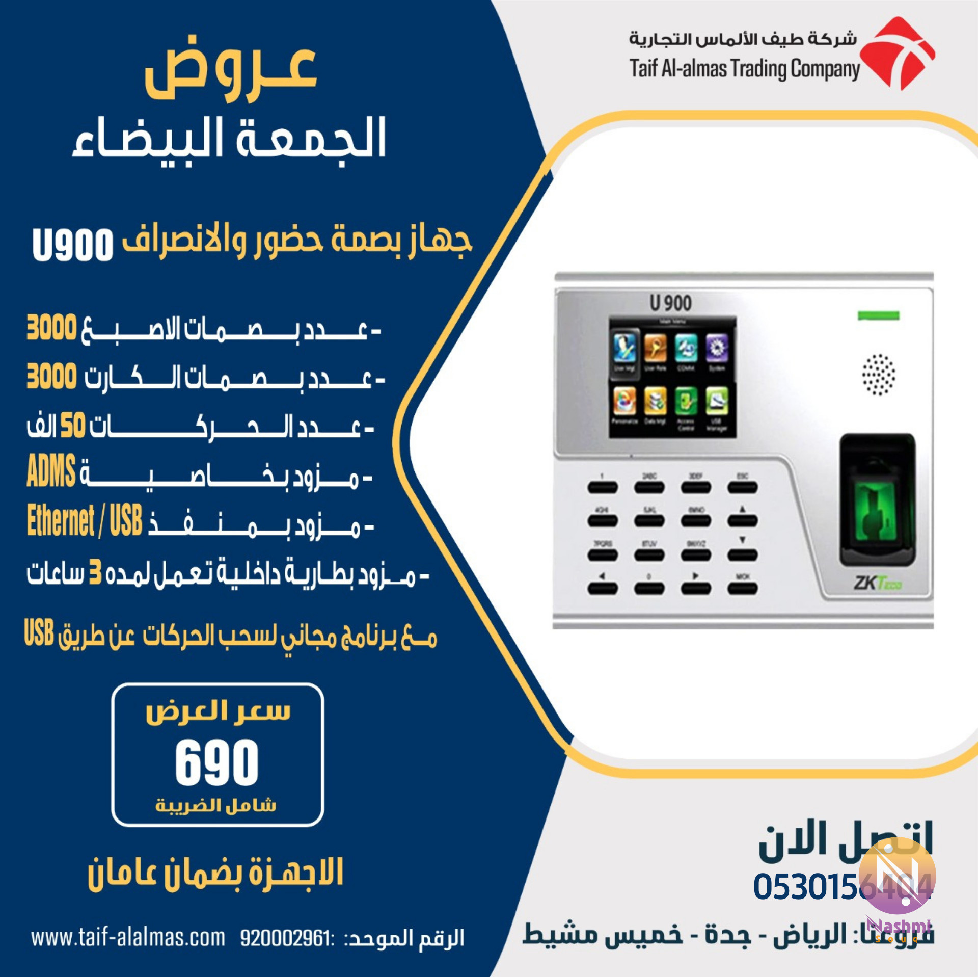 عروض الجمعة البيضاء من شركة طيف الالماس خاص ولفتره محدودة علي( كاميرات-اكسس-بصمة موظفين-انتركم-انذار سرقات-سنترالات-اجهزة تتبع سيارات بوابات مرور افراد-بوابات سيارات-بوابات كشف معادن-برامج ادارية ومحاسبيه ) العرض الاول مميزات جهاز بصمة للحضور والإنصراف للشركات ZKTECO U900 - يعمل بخاصية adms للربط. - يعمل ب (بصمه الاصبع -الكارت- الرقم السري ). - مزود ببطارية لتشغيل الجهاز لمدة 3 الي 4 ساعات. - يعمل بالبصمه والكارت والرقم السري. - واجهة التشغيل باللغتين العربية والانجليزية. - شاشة الوان. - نظام البرنامج سهل وبسيط. الرياض - جدة - خميس مشيط الضمان عامان ضد عيوب الصناعه