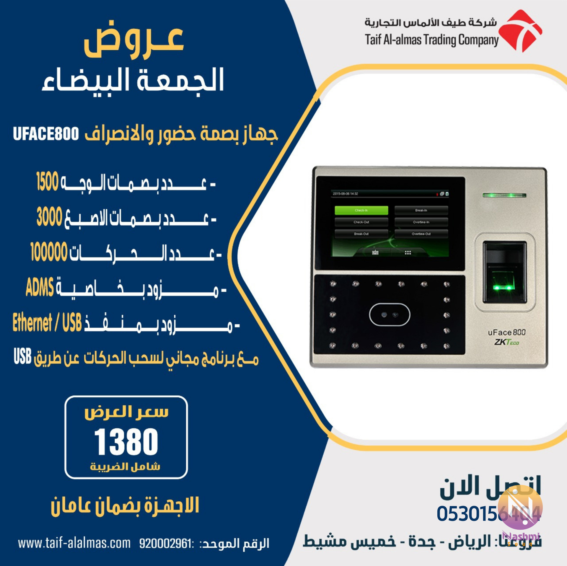 عروض الجمعة البيضاء من شركة طيف الالماس خاص ولفتره محدودة علي( كاميرات-اكسس-بصمة موظفين-انتركم-انذار سرقات-سنترالات-اجهزة تتبع سيارات بوابات مرور افراد-بوابات سيارات-بوابات كشف معادن-برامج ادارية ومحاسبيه ) العرض الاول *جهاز U FACE 800 اقوي جهاز بصمة موجود بيدعم خاصية الربط بالواي فاي ADMS بيسجل حتي 3000 بصمة العميل عاوز سحب البيانات عن طريق الفلاش (برنامج مجانًا)
