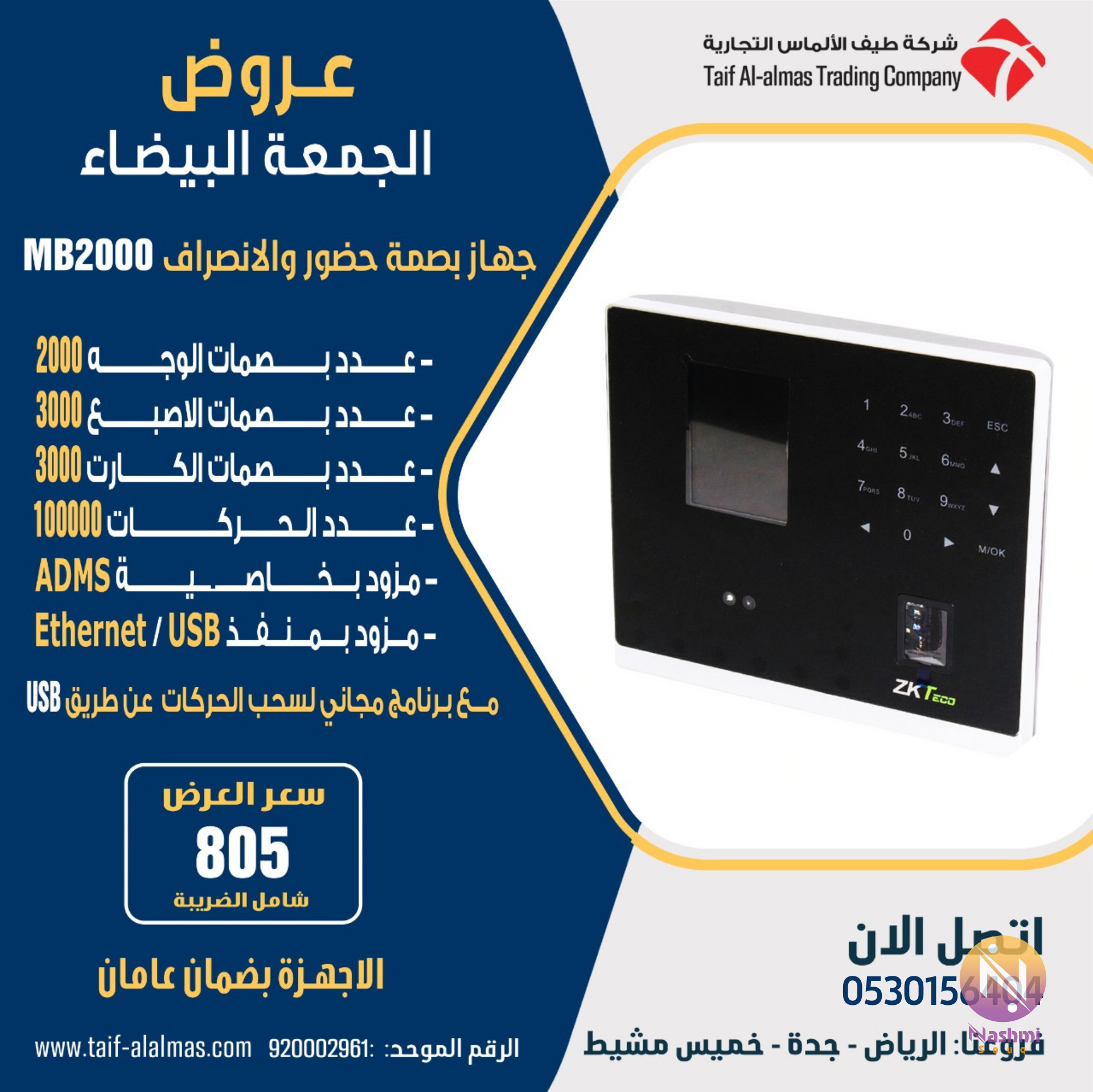 عروض الجمعة البيضاء من شركة طيف الالماس خاص ولفتره محدودة علي( كاميرات-اكسس-بصمة موظفين-انتركم-انذار سرقات-سنترالات-اجهزة تتبع سيارات بوابات مرور افراد-بوابات سيارات-بوابات كشف معادن-برامج ادارية ومحاسبيه ) العرض الاول مواصفات جهاز بصمه حضور والانصراف MB2000 ZKTeco يدعم 2000 بصمه وجه يدعم 3000 بصمه اصبع يدعم 3000 كارت عدد الحركات 100000 حركة مزود بمخرج USB /Ethernet مزود بخاصية ADMS الرياض - جدة - خميس مشيط
