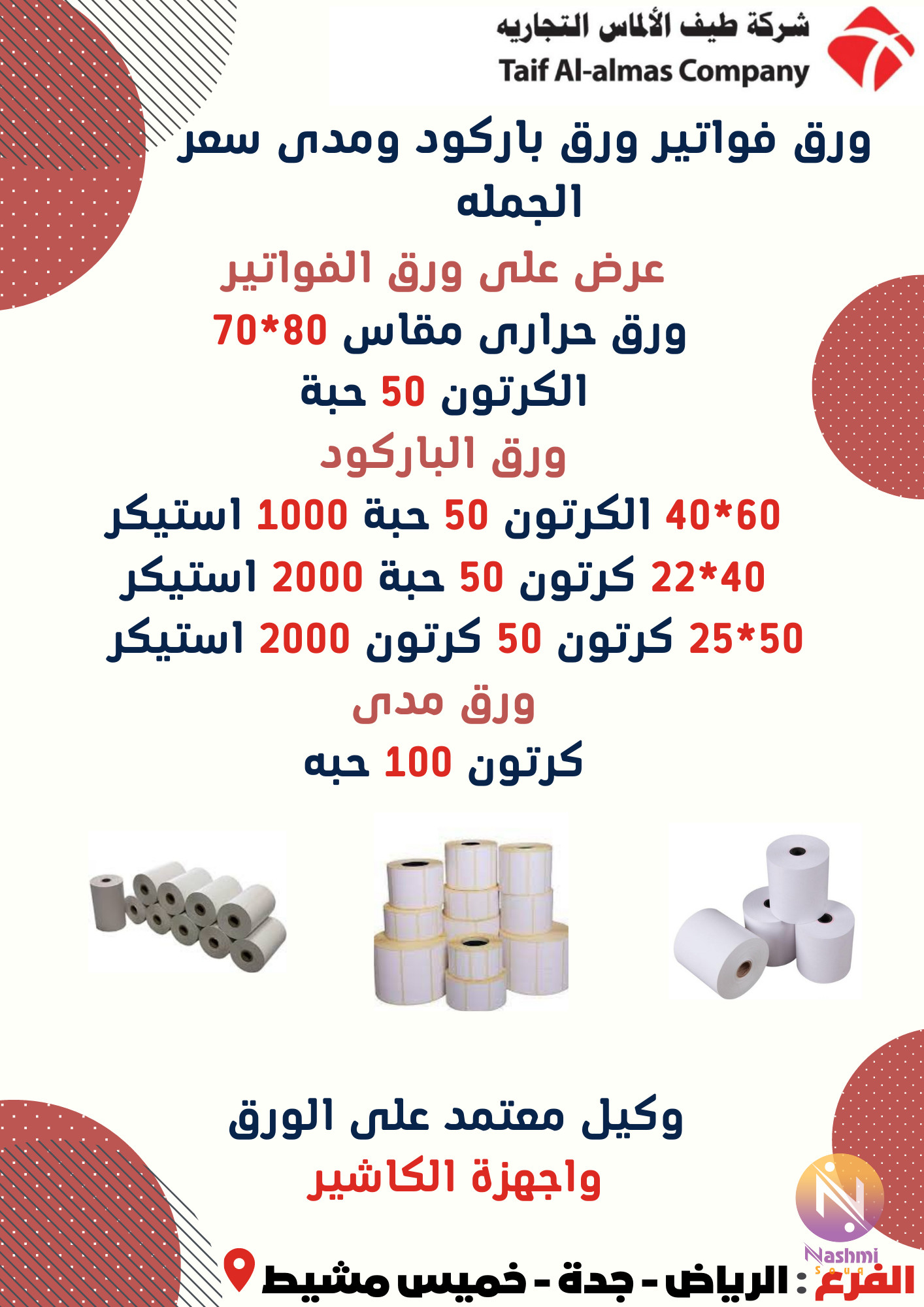 شركة طيف الالماس التجارية : للانظمة الامنية والبرامج المحاسبية متخصصون فى: اجهزة الكاشير وادوات الكاشير وورق الكاشير (ميزان-طابعة باركود-قارئ باركود-درج كاشير خمس خانات) بأرخص الاسعار مع ضمان عامان على الاجهزة 1-ميزان 2-طابعة باركود 3-قارئ باركود 4-درج كاشير خمس خانات سستم كاشير كامل للمطاعم والكوفى شوب وجميع الانشطة التجارية _اجهزة كاشير : 1-جهاز كاشير سوبرمركت 2-جهاز كاشير اكسسوارات 3-جهاز كاشيرخضراوات 4-جهاز كاشير مطاعم 5-جهاز كاشيركوفى شوب 6-جهاز كاشير حلاقة 7-جهاز كاشير محامص 8-جهاز كاشير قرطاسية 9-اخرى ..... _الاجهزة ضمان لمده عامان علي الاجهزه ضد عيوب الصناعه فروعنا " الرياض - جده -خميس مشيط " يوجد شحن لجميع انحاء المملكة لمعرفة المزيد من التفاصيل والعروض يرجي التواصل علي الرقم (اتصال او واتساب) : 0535301015