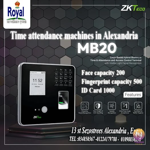 اجهزة حضور و انصراف في اسكندرية بصمة وجه #ZKTeco جهاز بصمة Zkteco #MB20 بصمة وجة: 200 عدد بصمات الاصبع: 500 اكسيس كنترول: فتح وغلق الباب شاشة الوان: تاتش سكرين بصمة الكارت: 1.000 عدد التحركات: 50.000حركة وضمان لمدة عام كامل مع الاستبدال عمل عقود صيانة وإصلاح لجميع الهيئات للأستعلام أتصل على 034850367 – 01224179788 – 01098836236 Whatsapp link: https://iwtsp.com/201224179788 * الشركة مسجلة ضريبيا و يوجد لدينا سجل تجاري * العنوان 13 st Sezostrees Alexandria Egypt