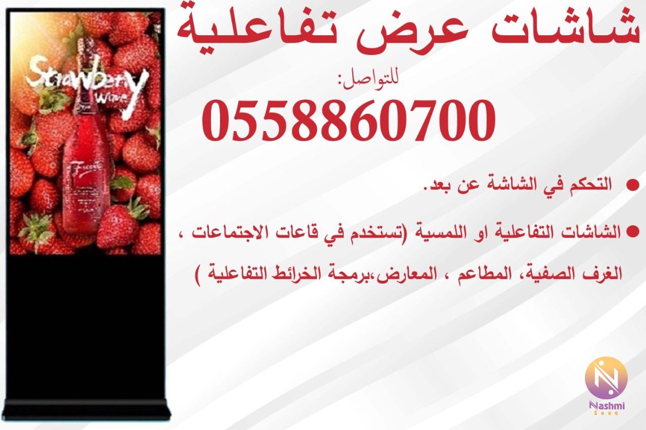 شاشات التفاعل الالكترونى تعتبر شاشات التفاعل الاكتروني من اهم وسائل العرض الخديثة اذا انها تقوم بعرض الماده المختاره عن طريق usb يوجد أحجام مختلفة من الشاشات لتلبية جميع الاغراض الشاشات تعمل بنظام الأندرويد أو الويندوز يوجد بها ريموت للتحكم عن بعد طولية وعرضية ويمكن توصيلها بالشبكة العنكبوتية ( الأنترنت ) بسهولة تصلح شاشات العرض التفاعليه للاستخدام الفنادق لعرض ماده دعائية المراكز التعليميه والجامعات المعارض والمولات الكبيره الخ والعديد من الأنشطة الأخرى فروعنا : ( جده - الرياض - القصيم -خميس مشيط - الخبر ) ودولة البحرين للطلب والمراسلة ت/ واتس 0558860700