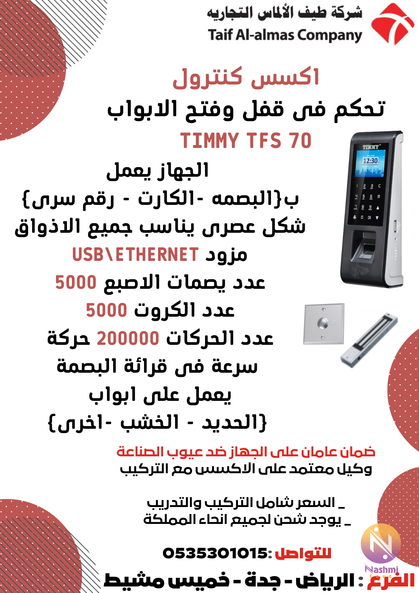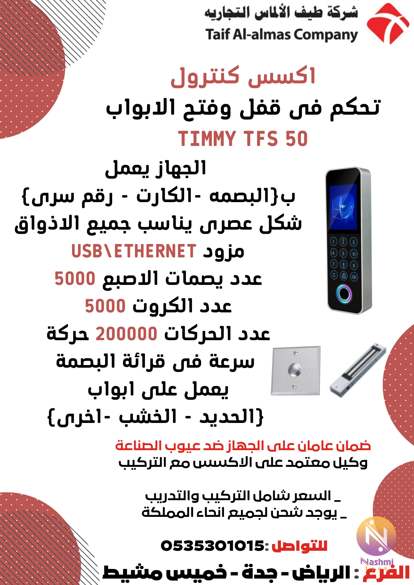 جهاز التحكم فى الابواب اكسس كنترول 1000 ريال متوفر لدينا أجهزة أكسس كنترول TIMMY نحن الوكيل الحصري لها بالسعودية ************* الموديل الأول جهاز أكسس كنترول TM-FS70 المواصفات : عدد البصمات 5000 الأف عدد الكروت 5000 الأف الجهاز يدعم البصمة والكارت والرقم السري عدد الحركات 200 الف حركة سعر الجهاز للمشاريع 1000 ريال + الضريبة 15 % شامل التركيب **************** الموديل الثاني جهاز أكسس كنترول TM-FS50 المواصفات : عدد البصمات 5000 الأف عدد الكروت 5000 الأف الجهاز يدعم البصمة والكارت والرقم السري عدد الحركات 200 الف حركة سعر الجهاز للمشاريع 1100 ريال + الضريبة 15 % شامل التركيب يتميز الجهاز بشكلة الأنيق وحجمة الصغير مما يعطيه شكل انسيابي ****************** الموديل الثالث جهاز أكسس كنترول TM-FS50W مقاوم للماء Waterproof المواصفات : عدد البصمات 5000 الأف عدد الكروت 5000 الأف الجهاز يدعم البصمة والكارت والرقم السري عدد الحركات 200 الف حركة سعر الجهاز للمشاريع 1400 ريال + الضريبة 15 % شامل التركيب يتميز الجهاز بشكلة الأنيق وحجمة الصغير مما يعطيه شكل انسيابي ***************** ضمان عامان ضد عيوب الصناعة wa.me/966535301015 للتواصل والاستفسار : الجوال او واتس اب : 0535301015 فروعنا " الرياض , جدة , ابها " #اكسسكنترول# #للتحكم# #الابواب# #قفلالكتروني##اكسسكنترول# #للتحكم# #الابواب# #قفلالكتروني##اكسسكنترول# #للتحكم# #الابواب# #قفلالكتروني##اكسسكنترول# #للتحكم# #الابواب# #قفلالكتروني##اكسسكنترول# #للتحكم# #الابواب# #قفلالكتروني##اكسسكنترول# #للتحكم# #الابواب# #قفلالكتروني#