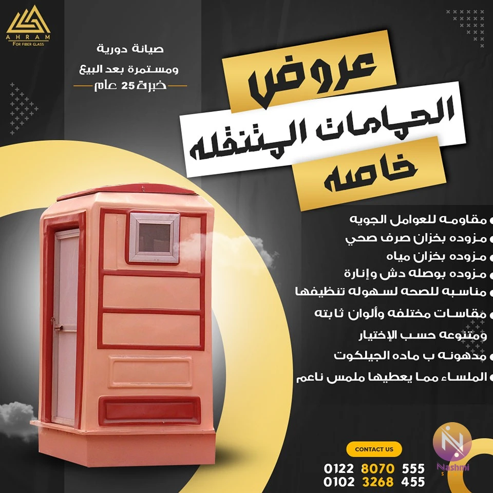 الاهرام للفيبر جلاس الشركة الاولى فى مصر والشرق الاوسط خبرة اكتر من 30عام فى تصميم وتصنيع الحمامات المتنقلة بجميع مقاساتها وكاملة المشتملات وحمامات الدبل كبينة حمامات متنقلة مصنعة من اجود خامات الفيبر جلاس اللى يعيش معاك العمر كله والاهرام للفيبر جلاس بتقدملك الحمام للاستخدام على طول واللون كمان حسب الطلب http://www.ahram4fiber.com/ar/ www.ahram4fiber.com