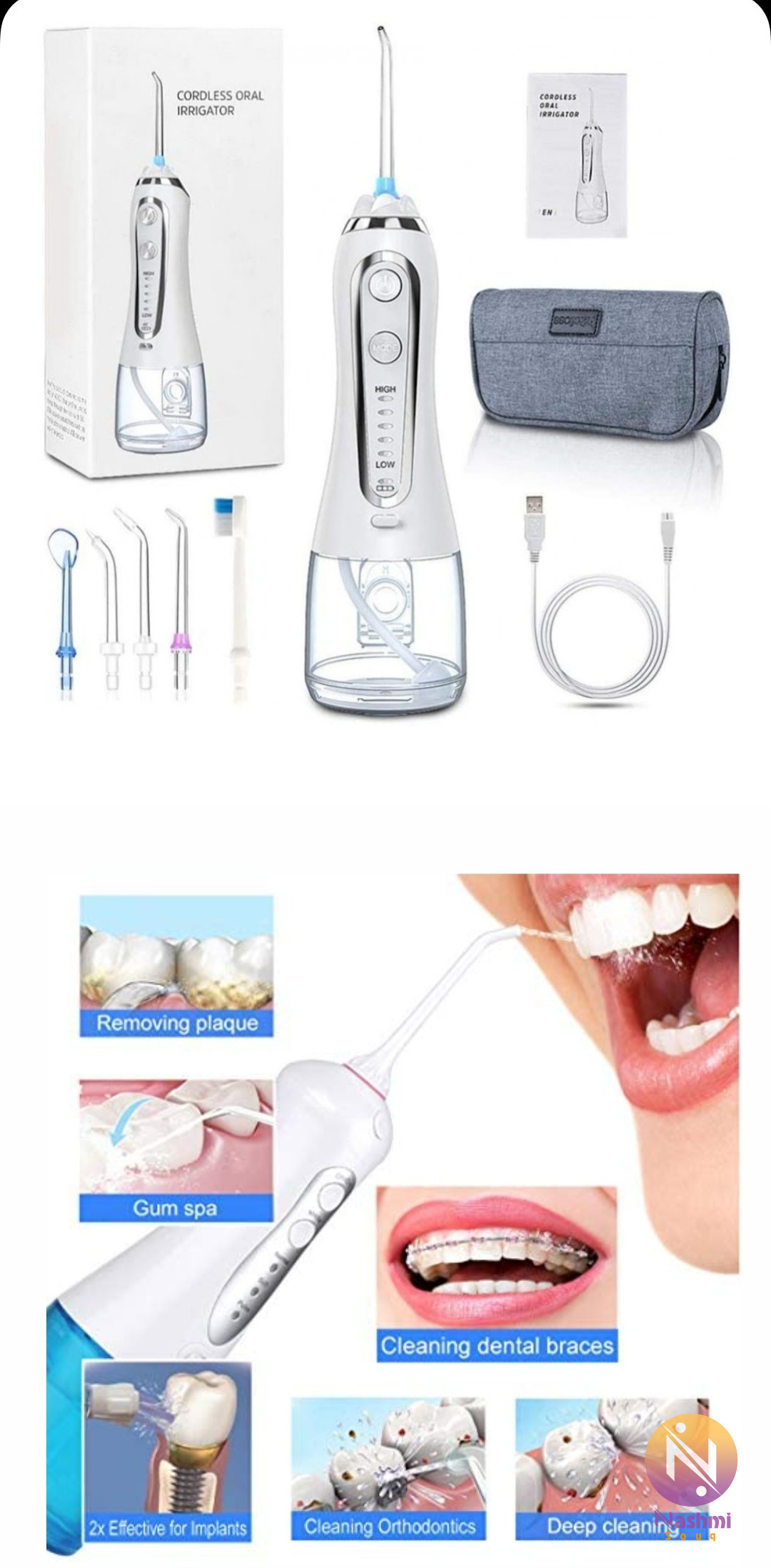 منتج عالي الأداء لصحة الأسنان واللثة. الري ثابت ويوفر ضغط رش الماء بقوة 60-120 رطل لكل بوصة مربعة. سيساعدك جهاز الري في تنظيف كل سن بطريقة لا تفعلها مع أي خيط تنظيف تقليدي. يساعد الري في إزالة البقع و أي بقايا طعام عادة ما تكون غير مرئية للعين المجردة. سوف يساعد الري في استعادة نظافة الفم وتحسين رائحة الفم
