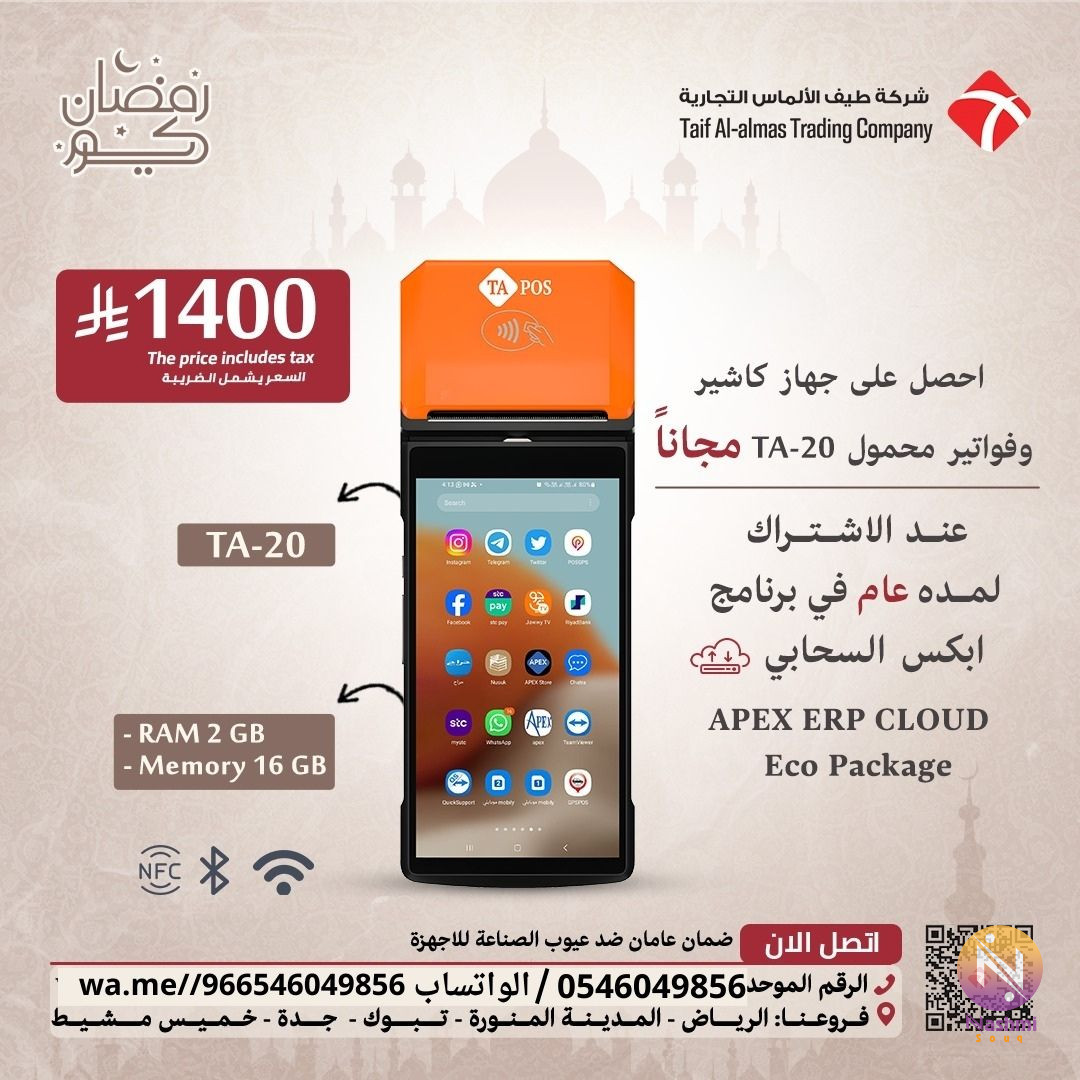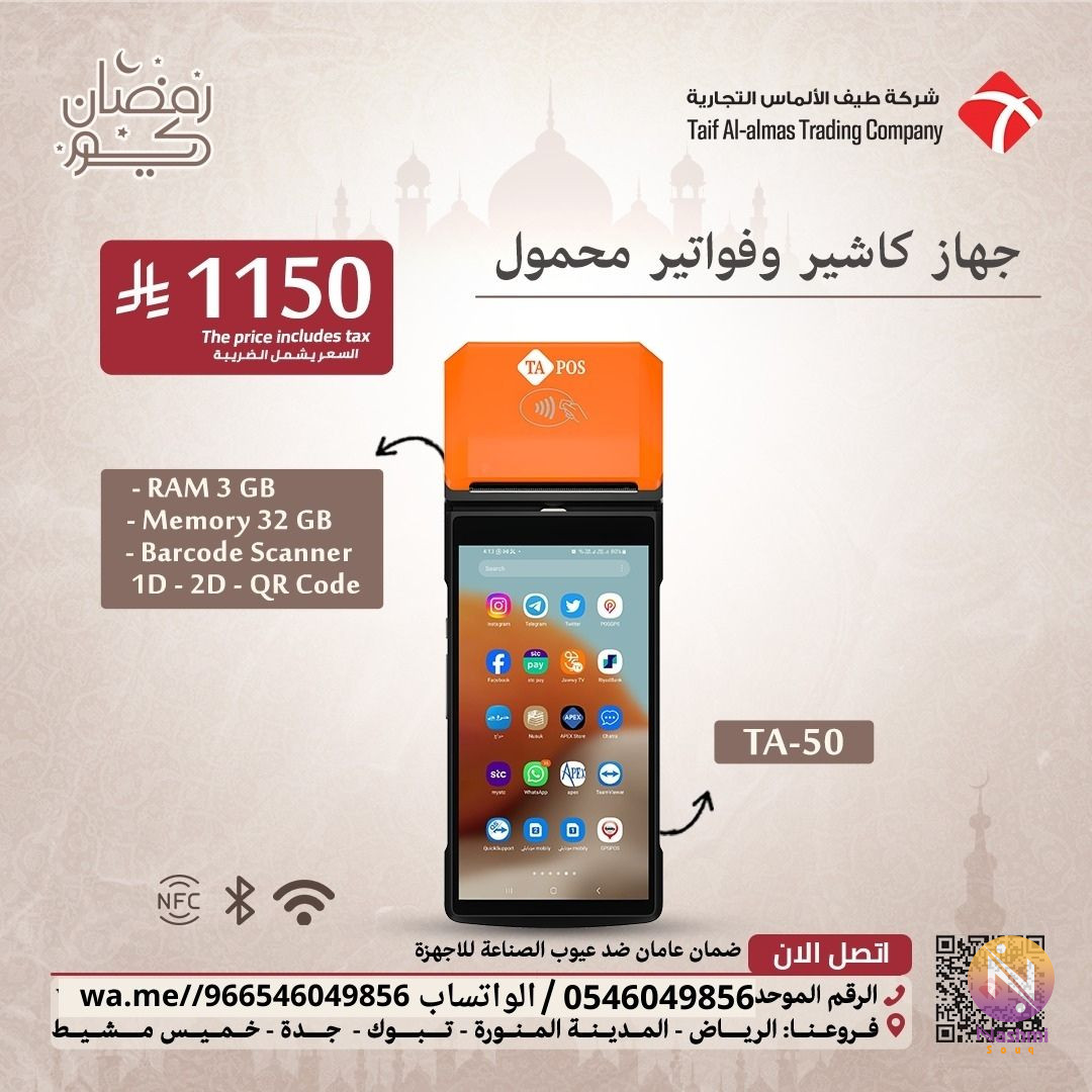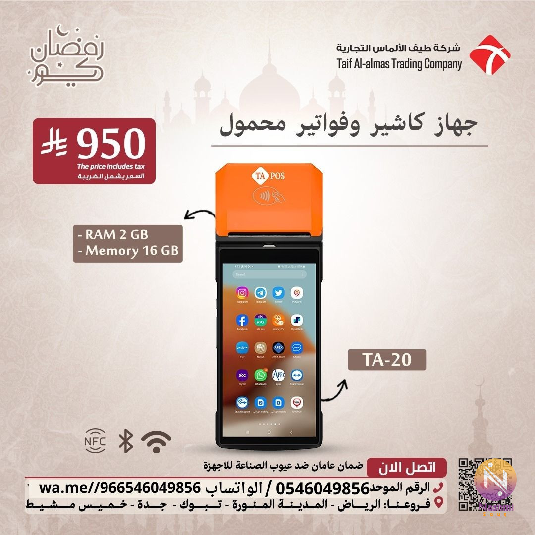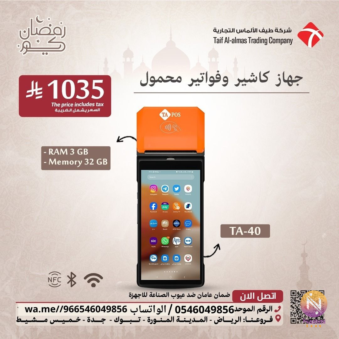 يُقدم كاشير متنقل حلاً للشركة، ابتكارًا في التعاملات والمبيعات بطريقة سريعة وبسيطة. يجعل هذا الجهاز ليتناسب مع احتياجات الشركات الصغيرة، والمطاعم، والأنشطة التجارية للهاتف المحمول، حيث يتيح ذلك - جهاز كاشير محمول بطابعة داخلية مزود ب WI FI / بلوتوث - جهاز محمول يعمل بنظام Android مع طابعة يساعدك فى إجراء معاملات البيع والشراء في أثناء التنقل، مثل الأكشاك المتنقلة أو في منزل العميل كما يمكن استخدامها أيضًا كنظام احتياطي في حالة تعطل نقطة بيع رئيسية لنقاط البيع ● متوفر جهاز نقطة البيع المحموله (POS) متوفر بسعر الجملة للكميات واسعار تنافسية للتجزئة ● مواصفات جهاز الكاشير المحمول TA POS-20 - مزوده ب Wi Fi LFC 4G - دعم مجموعة متنوعة من طرق الدفع السائدة - نظام تشغيل اندرويد 13 احدث اصدار بالسوق - شاشة تعمل باللمس بحجم 5.5 بوصة - طابعة فواتير داخلية متكاملة تعمل بلوتوث - رمات 2 جيجا - ذاكرة داخلية 16 جيجا - بطارية تدوم لمدة 12 ساعة ● مواصفات جهاز الكاشير المحمول TA POS-40 - مزوده ب Wi Fi LFC 4G - دعم مجموعة متنوعة من طرق الدفع السائدة - نظام تشغيل اندرويد 13 احدث اصدار بالسوق - شاشة تعمل باللمس بحجم 5.5 بوصة - طابعة فواتير داخلية متكاملة تعمل بلوتوث - رمات 3 جيجا - ذاكرة داخلية 32 جيجا - بطارية تدوم لمدة 12 ساعة ############################################## #كاشير_ذكي #أجهزة_دفع_إلكتروني #تقنية_متطورة #نقاط_البيع #إدارة_المبيعات #تسهيل_الدفع #تكنولوجيا_متقدمة #جهاز_كاشير_محمول #جهاز_كاشير_متنقل #اجهزة كاشير#انظمة مبيعات#انظمة مبيعات دسك توب #انظمة مبيعات اون لاين_نظام مبيعات سحابى #أنظمة_مبيعات#إدارة_المبيعات #شاشاتة كاشير تعمل باللمس #ميزان باركود_الكترونى#طابعة فواتير_حرارية#طابعة بركود#قارئ باركود#قارئ باركود لاسلكى #قارئ باركود_بلوتوث#ورق فواتير#ورق ايصالات#ورق بوليصات الشحن#ورق شبكة#ورق مدى#درج نقود#نقطة بيع محمولة#كاشير متنقل#سستم مبيعات#اشير تاتش ● فروعنا: -الرياض-جده-خميس مشيط-المدينة المنورة-تبوك -ضمان عامان على جميع المنتجات -فريق محترف للتركيب والبرمجة -خدمة دعم فنى بعد البيع ● الجوال :(0546049856) ● واتساب :wa.me//966546049856#