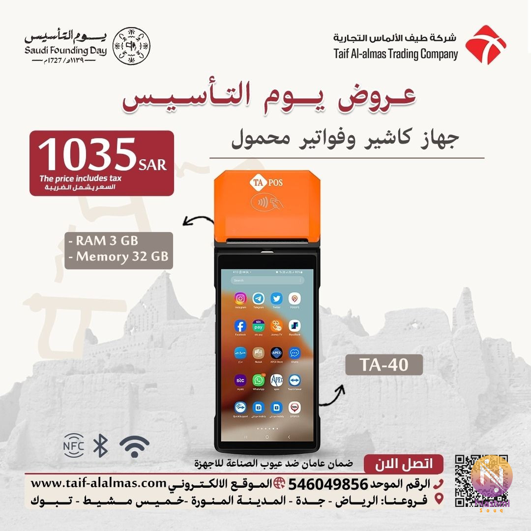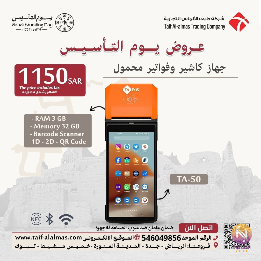 يُقدم كاشير متنقل حلاً للشركة، ابتكارًا في التعاملات والمبيعات بطريقة سريعة وبسيطة. يجعل هذا الجهاز ليتناسب مع احتياجات الشركات الصغيرة، والمطاعم، والأنشطة التجارية للهاتف المحمول، حيث يتيح ذلك - جهاز كاشير محمول بطابعة داخلية مزود ب WI FI / بلوتوث - جهاز محمول يعمل بنظام Android مع طابعة يساعدك فى إجراء معاملات البيع والشراء في أثناء التنقل، مثل الأكشاك المتنقلة أو في منزل العميل كما يمكن استخدامها أيضًا كنظام احتياطي في حالة تعطل نقطة بيع رئيسية لنقاط البيع ● متوفر جهاز نقطة البيع المحموله (POS) متوفر بسعر الجملة للكميات واسعار تنافسية للتجزئة ● مواصفات جهاز الكاشير المحمول TA POS-20 - مزوده ب Wi Fi LFC 4G - دعم مجموعة متنوعة من طرق الدفع السائدة - نظام تشغيل اندرويد 13 احدث اصدار بالسوق - شاشة تعمل باللمس بحجم 5.5 بوصة - طابعة فواتير داخلية متكاملة تعمل بلوتوث - رمات 2 جيجا - ذاكرة داخلية 16 جيجا - بطارية تدوم لمدة 12 ساعة ● مواصفات جهاز الكاشير المحمول TA POS-40 - مزوده ب Wi Fi LFC 4G - دعم مجموعة متنوعة من طرق الدفع السائدة - نظام تشغيل اندرويد 13 احدث اصدار بالسوق - شاشة تعمل باللمس بحجم 5.5 بوصة - طابعة فواتير داخلية متكاملة تعمل بلوتوث - رمات 3 جيجا - ذاكرة داخلية 32 جيجا - بطارية تدوم لمدة 12 ساعة ############################################## #كاشير_ذكي #أجهزة_دفع_إلكتروني #تقنية_متطورة #نقاط_البيع #إدارة_المبيعات #تسهيل_الدفع #تكنولوجيا_متقدمة #جهاز_كاشير_محمول #جهاز_كاشير_متنقل #اجهزة كاشير#انظمة مبيعات#انظمة مبيعات دسك توب #انظمة مبيعات اون لاين_نظام مبيعات سحابى #أنظمة_مبيعات#إدارة_المبيعات #شاشاتة كاشير تعمل باللمس #ميزان باركود_الكترونى#طابعة فواتير_حرارية#طابعة بركود#قارئ باركود#قارئ باركود لاسلكى #قارئ باركود_بلوتوث#ورق فواتير#ورق ايصالات#ورق بوليصات الشحن#ورق شبكة#ورق مدى#درج نقود#نقطة بيع محمولة#كاشير متنقل#سستم مبيعات#اشير تاتش ● فروعنا: -الرياض-جده-خميس مشيط-المدينة المنورة-تبوك -ضمان عامان على جميع المنتجات -فريق محترف للتركيب والبرمجة -خدمة دعم فنى بعد البيع ● الجوال :(0546049856) ● واتساب :wa.me//966546049856#