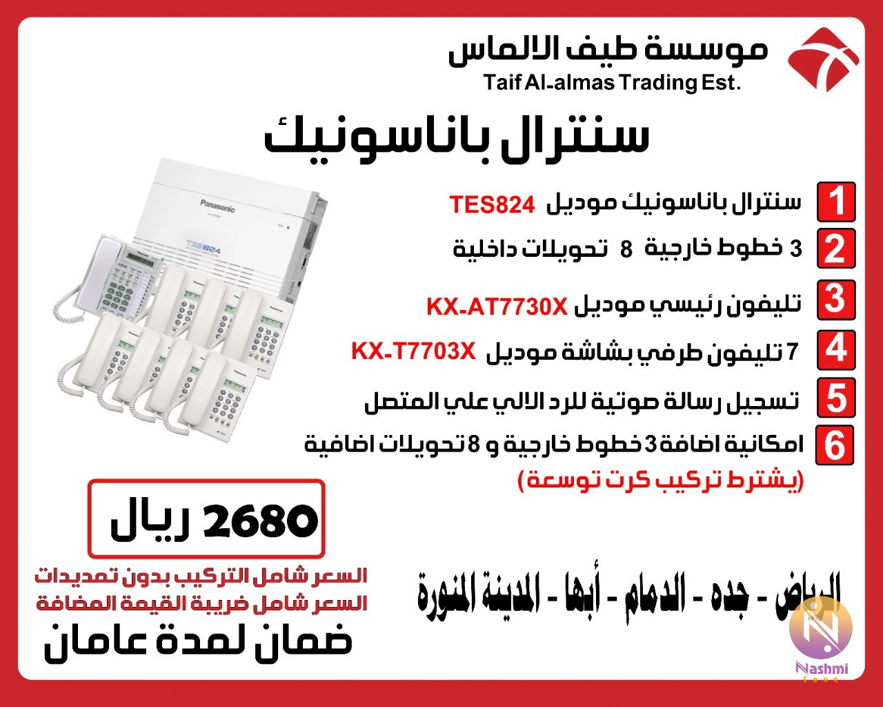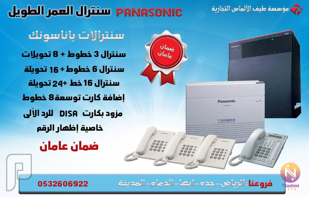 مؤسسة طيف الالماس التجارية للانظمة الامنية تقدم كتالوج المنتجات ( كاميرات مراقبة - سنترالات - كاشير- اكسس كنترول - حضور وانصراف - تتبع - مصد - بوابات - نقاط بيع - انتركم - انذار سرقات ) عبر الواتساب عن طريق الجول : 0559482145 \تشرف مؤسسه طيف الالماس التجاريه بان تقدم لكم عرض ✹سنترالات باناسونيك✹ - سنترال باناسونيك 3خطوط + 8تحويلة - سنترال باناسونيك 6خطوط + 16 تحويلة - سنترال باناسونيك 16 خط خارجى+24تحويلة أكثر من 100 تحويلة - خاصية النداء الالي مع التحويلات الرئيسية - تحويل المكالمات للهواتف الفرعية والعكس للرئيسية - السنترال يحتوى على كارت DISA للرد الاّلي - السنترالات مزودة بخاصية اظهار الرقم - مكانية حجز المكالمات المشغولة (للخطوط الداخلية والخارجية ) - امكانية اعادة الاتصال وتخزين الارقام - امكانية توصيلة بالانتركم وبالبريد الصوتى VOICE MAIL - امكانية اضافة كرت توسعة 8 خطوط لتزويد عدد الخطوط - خاصية التحكم فى الصوت - امكانية تفعيل الرد التلقائى - خاصية تسجيل المكالمات بشكل اّلى - متوفرة بأشكال واحجام مختلفة تناسب جميع المجالات ✔ (ضمان سنتين للاجهزة ضد عيوب التصنيع) ✔ (تدريب وتركيب مجانا) ✹ الفروع ( الرياض - جدة - الدمام - ابها -المدينة المنورة) __________________________________________________ ●للمزيد من العروض ومتابعة كل جديد من التخفيضات والمنتجات الخاصة بالمؤسسة يشرفنى زيارة قناتى على التليجرامt.me/taifalalms ● للتواصل والحصول على المنتج (جوال-واتس اب) 0559482145