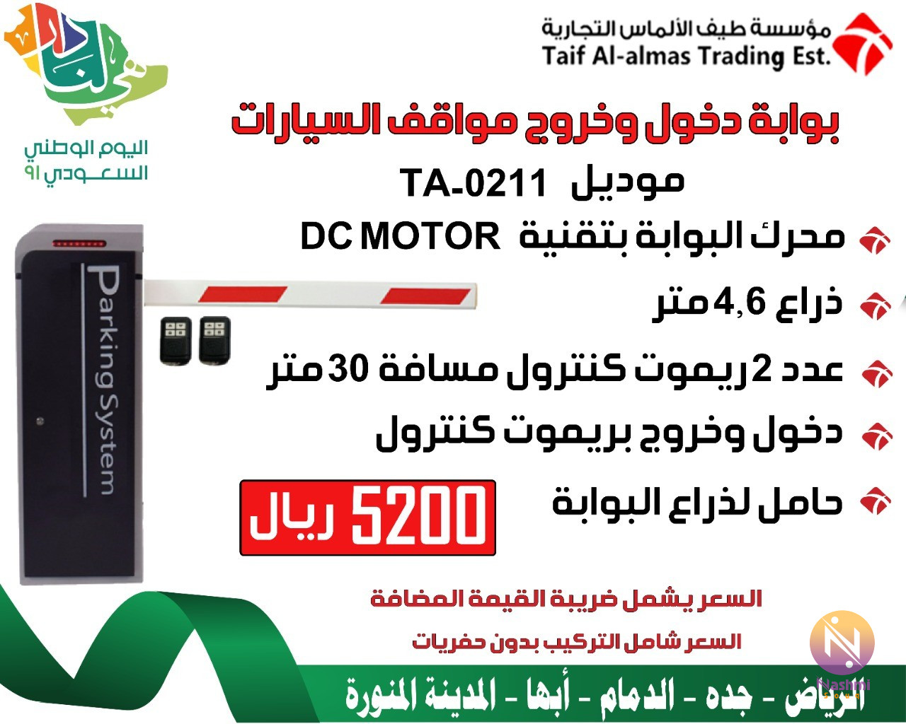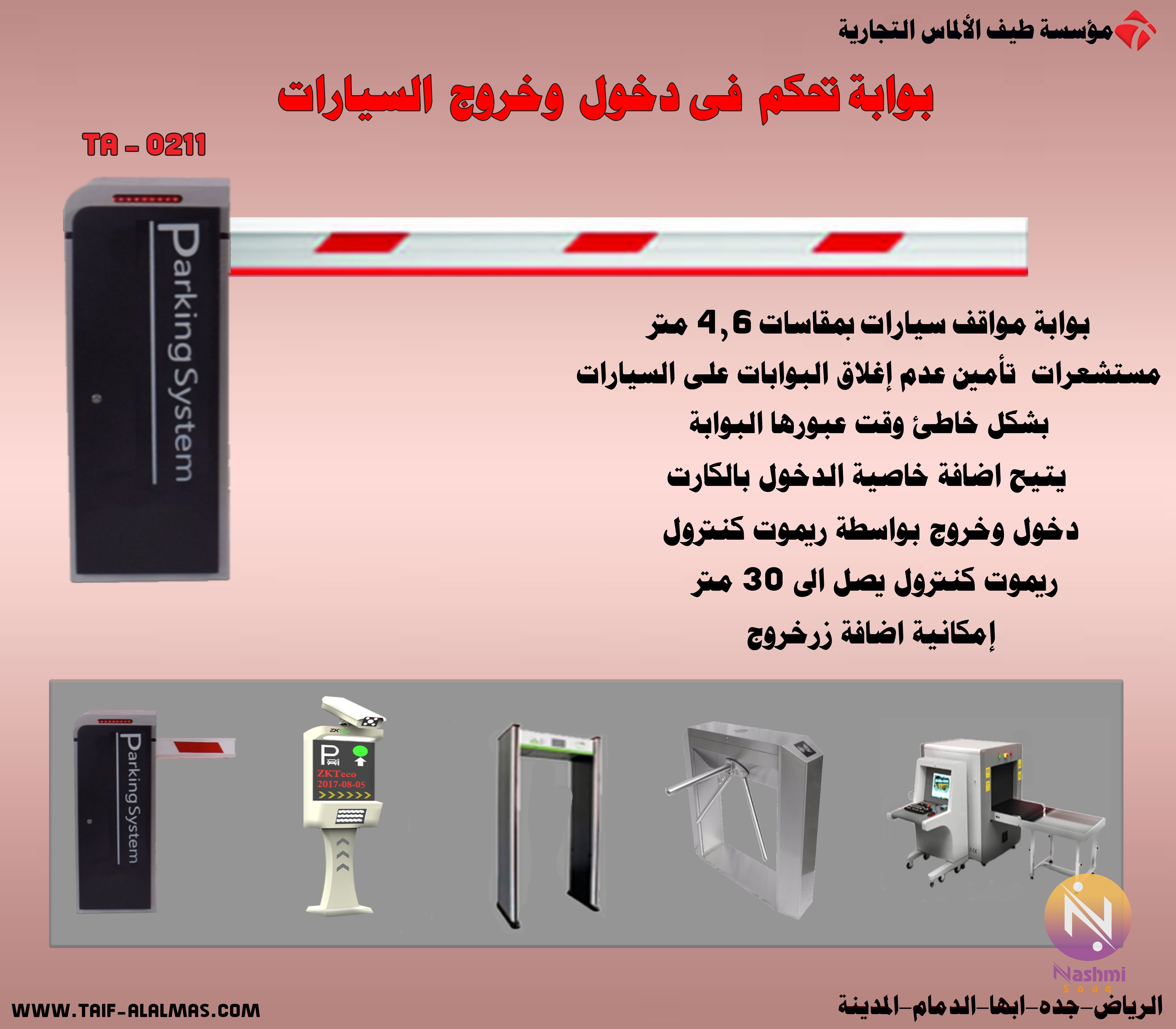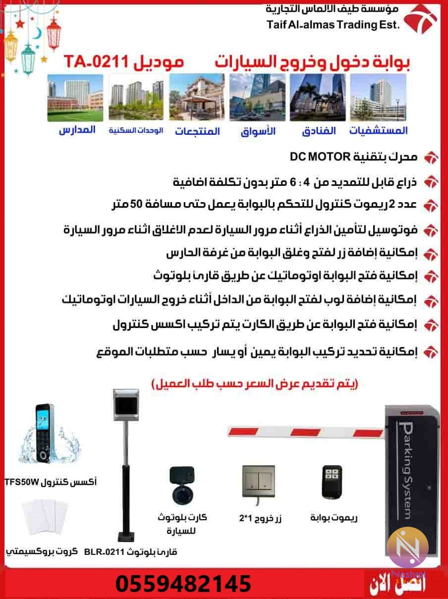 مؤسسة طيف الالماس التجارية للانظمة الامنية تقدم كتالوج المنتجات ( كاميرات مراقبة - سنترالات - كاشير- اكسس كنترول - حضور وانصراف - تتبع - مصد - بوابات - نقاط بيع - انتركم - انذار سرقات ) عبر الواتساب عن طريق الجول : 0559482145 \تشرف مؤسسه طيف الالماس التجاريه بان تقدم لكم عرض\ بوابات الكترونية مصدات مواقف للتحكم فى دخول وخروج السيارات متخصصون فى البوابات الأمنية وانظمة التحكم فى الدخول والخروج السيارات فى جميع انحاء المملكة العربية السعودية نقدم لقم الحلول الامنية التى تناسب جميع الاماكن العامة والخاصة (النوادى,الجراجات العامة, الجراجات الخاصة,الفنادق,الشركات) نقدم لكم ●بوابات مواقف السيارات الإلكترونية للتحكم فى دخول وخروج السيارات توفر أنظمة التحكم في دخول وخروج السيارات العديد من المزايا التي تضمن الإنضباط والتنظيم والدقة في عبور السيارات لتفادي الكثير من المشكلات يتم فتح البوابات الإلكترونية تلقائيا بمجرد اقتراب السيارات المصرح لها العبور من خلال قراءة بيانات السيارة عن بعد أو من خلال إستخدام البطاقات الذكية او كلمات المرور او بإستخدام أجهزة التحكم عن بعد (ريموت كنترول) ويكون ذلك من خلال إعطاء صلاحيات لأشخاص سيارات محددة يمكنهم عبور هذه البوابات في أوقات وتواريخ محددة يتم التحكم فيها من خلال نظام التحكم في الدخول Access Control. ●مواصفات بوابات السيارات -بوابات مواقف السيارات (بوابات الجراجات,انظمة الجراجات) -بوابات للتحكم فى دخول وخروج السيارات -مقاسات 4 و 6 متر -مزودة بمستشعيرات عدم اغلاق البوابة على السيارة اثناء المرور(فوتوسيل) -يتيح خاصية الدخول بالكارت -دخول وخروج من خلال الريموت كنترول -الريموت كنترول يصل الى 30 متر -امكانية اضافة زر خروج من الداخل -يمكن الدخول من خلال قارئ البلوتوث - الدخول من خلال حساسات توضع بالارض (لوب) عند المرور عليه يتم فتح البوابة تلقائيا" ●حاجز ومصد مواقف السيارات جهاز لحل ازمه المواقف في الشقق والمنازل وحتى الشركات. هذا الجهاز يركب امام الموقف حقك ويمنع اي شخص من الوقوف امامه. له ريموت للفتح والقفل على مسافة 10 متر ميزاته ومواصفاتة:- ✔ ضد السرقه(مساميره داخليه ولا تقدر تفتحها الا بعد ما تفتح غطاء الجهاز بالمفتاح الخاص له) ✔ يتحمل 3 طن ✔ ضد المويه والغبار ✔ له انذار في حاله التلاعب فيه. ✔ قابل للنقل لاي مكان اخر.(فقط فك المسامير وركبه في الموقع الجديد) ✔ يعمل بالبطاريه مقاس دي لمده فوق 8 اشهر وتغيرها ما ياخذ دقيقه ✔ شكله انيق وعصرى يناسب جميع الاذواق ✔ مصنوع من الحديد القوي وزنه 9 كج تقريبا ✔ في حال الاصتدام به والعامود مرفوع لا يتاثر بشي وينزل العامود ولكن يشتغل الانذار حتى تخرج السياره من الموقف. ✔ الجهاز صناعته صينيه وجودته عاليه جدا ✔ يتحمل الحراره الى 65 درجه مئويه ✔ يجي معاه ثلاث مسامير وريموتين ومفتاحين والجهاز ●للمزيد من العروض ومتابعة كل جديد من التخفيضات والمنتجات الخاصة بالمؤسسة يشرفنى زيارة قناتى على التليجرام t.me/taifalalms -جميع الاجهزة بالضمان -فروعنا: الرياض,جدة,الدمام,المدية,ابها للتوصل \0559482145