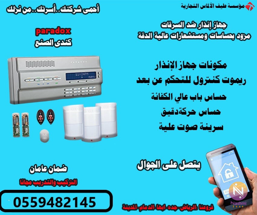 مؤسسة طيف الالماس التجارية للانظمة الامنية تقدم كتالوج المنتجات ( كاميرات مراقبة - سنترالات - كاشير- اكسس كنترول - حضور وانصراف - تتبع - مصد - بوابات - نقاط بيع - انتركم - انذار سرقات ) عبر الواتساب عن طريق الجول : 0559482145 تشرف مؤسسه طيف الالماس التجاريه بان تقدم لكم عرض Paradox Magellan 2-partion 64 – zone wireless console with rechargeable batteries (Made in Canada) وحده تحكم جهاز الانذار من نوع برادوكس مزوده ببيت الشريحه للاتصال ومزوده ببطاريه خارجيه فى حال انقاطع الكهرباء صنع فى كندا ** Paradox remote control with backlit buttons (Made in Canada) ريموت كنترول للتحكم بالجهاز عن بعد صنع فى كندا ** Paradox wireless siren with built –in strobe light and batteries (Made in Canada) سرينه انذار عاليه الصوت مع ضوء مزوده ببطاريه خارجيه صنع فى كندا **Paradox wireless analog single-optic Motion Detector حساس حركة مزود ببطاريه خارجيه صنع فى كندا ** حساس باب مزود ببطاريه خارجيه صنع فى كندا * يمكن اضافة عدد كبير من الحساسات * يمكن اضافة 5 شرائح جوال للجهاز الواحد *العرض شامل التركيب *ضمان لمده عامان العرض لفتره محدوده جدا _____________________________________________ ●للمزيد من العروض ومتابعة كل جديد من التخفيضات والمنتجات الخاصة بالمؤسسة يشرفنى زيارة قناتى على التليجرام\t.me/taifalalms للاستعلام \وتس اب \ الجوال\0559482145
