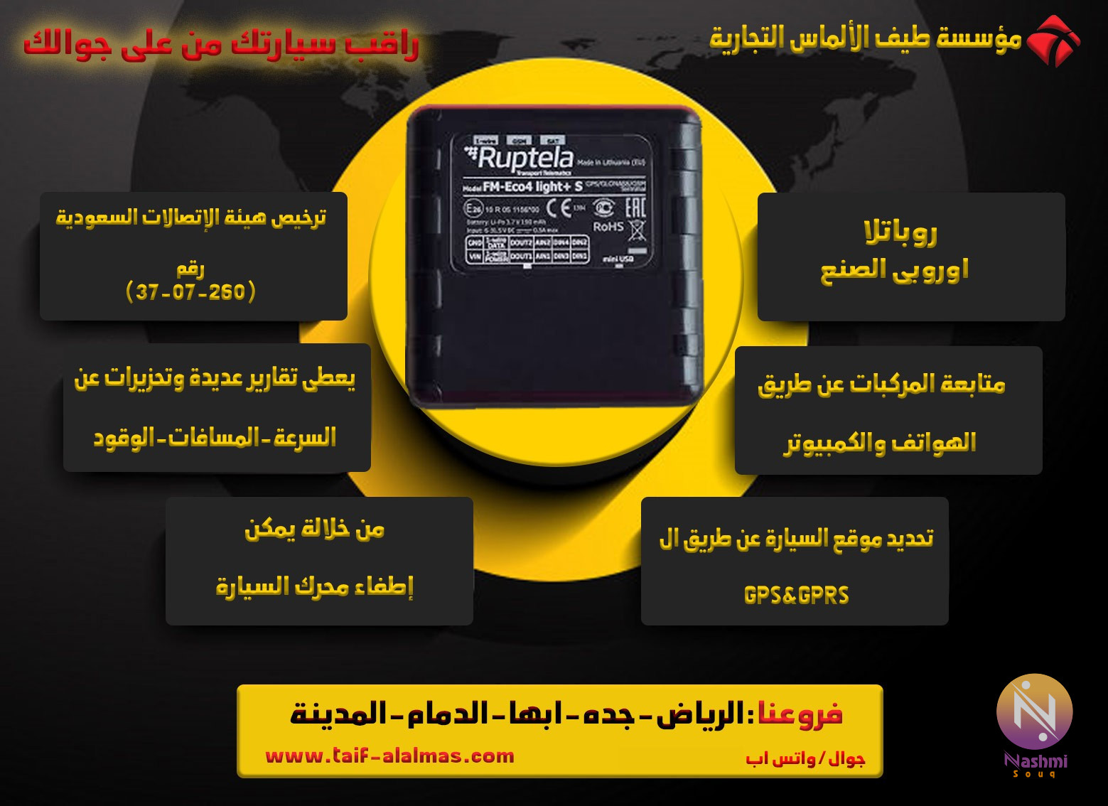مؤسسة طيف الالماس التجارية للانظمة الامنية تقدم كتالوج المنتجات ( كاميرات مراقبة - سنترالات - كاشير- اكسس كنترول - حضور وانصراف - تتبع - مصد - بوابات - نقاط بيع - انتركم - انذار سرقات ) عبر الواتساب عن طريق الجول : 0559482145 تشرف مؤسسه طيف الالماس التجاريه بان تقدم لكم عرض هل تخشى على سيارتك من السرقة ؟ هل تريد ان تراقب سيارتك وتعرف موقعها فى أى مكان على مدار الساعة؟ هل تريد أن تصلك تقارير عن الوقود -السرعات -المسافات....الخ؟ اليك جهاز روباتيلا الأوروبى الصنع أقوى جهاز تتبع للسيارات فى العالم عن طريق GPS & GPRS راقب سيارتك جهاز تتبع سيارات Model- Ruptela Eco light ( اوروبى الصنع) - جهاز اوربى الصنع مزود برقائق U BLOX السويسرية - يمكنك من متابعة مركبتك بشكل سهل ودقيق باحدث التقنيات فى عالم الـ GPS وGPRS . - حجم صغير. 82X63 X 28 مم يمكن تركيبة باى مكان فى السيارة . - يحدد المواقع عن طريق خدمة ال GPS و GPRS بدقة عالية - ترخيص هيئة الاتصالات لإدارة أجهزة تتبع المركبات رقم ( 260- 07 – 37 ) . - تحديد نقطة بداية ونهاية واماكن توقف للمركبة بدقة عالية. - متابعة المركبة عن طريق الهواتف الذكية والكمبيوتر . - تقرير عن مسار المركبات لفترات ( يوم ، شهر ، سنة ) . - تحديد مناطق الأمان وارسال تنبيهات في حالة مغادرة المنطقة المسموح بها . - تحديد سرعات آمنة مع ارسال تحذيرات حال تجاوز السرعات . - امكانية إيقاف السيارة عن طريق تطبيق الخدمة يشترط تركيب حساس اطفاء محرك السيارة . - تقارير عديدة عن المسافات ، السرعات ، الوقودمع تقارير اخرى شاملة ومتنوعة . - تقرير التوقف والوقت الضائع وتقارير بالقيادة المتهورة. - حاصل علي ترخيص الهيئه السعودية ✹فديو لتوضيح مميزات الجهاز youtu.be/Z3GEVOpeUic ✹ ضمان لمدة عامان ✹ الصناعه اوروبية ✹ شريحة مجانية مشحونة لمدة عام ✹ الدعم الفني + التركيب مجانا ●للمزيد من العروض ومتابعة كل جديد من التخفيضات والمنتجات الخاصة بالمؤسسة يشرفنى زيارة قناتى على التليجرام t.me/taifalalms يرجى التواصل على: رقم / موبايل- وتس0559482145 يمكن متابعه قناه التليجرم لمشاهده اقوي العروض الجديده t.me/taifalalms