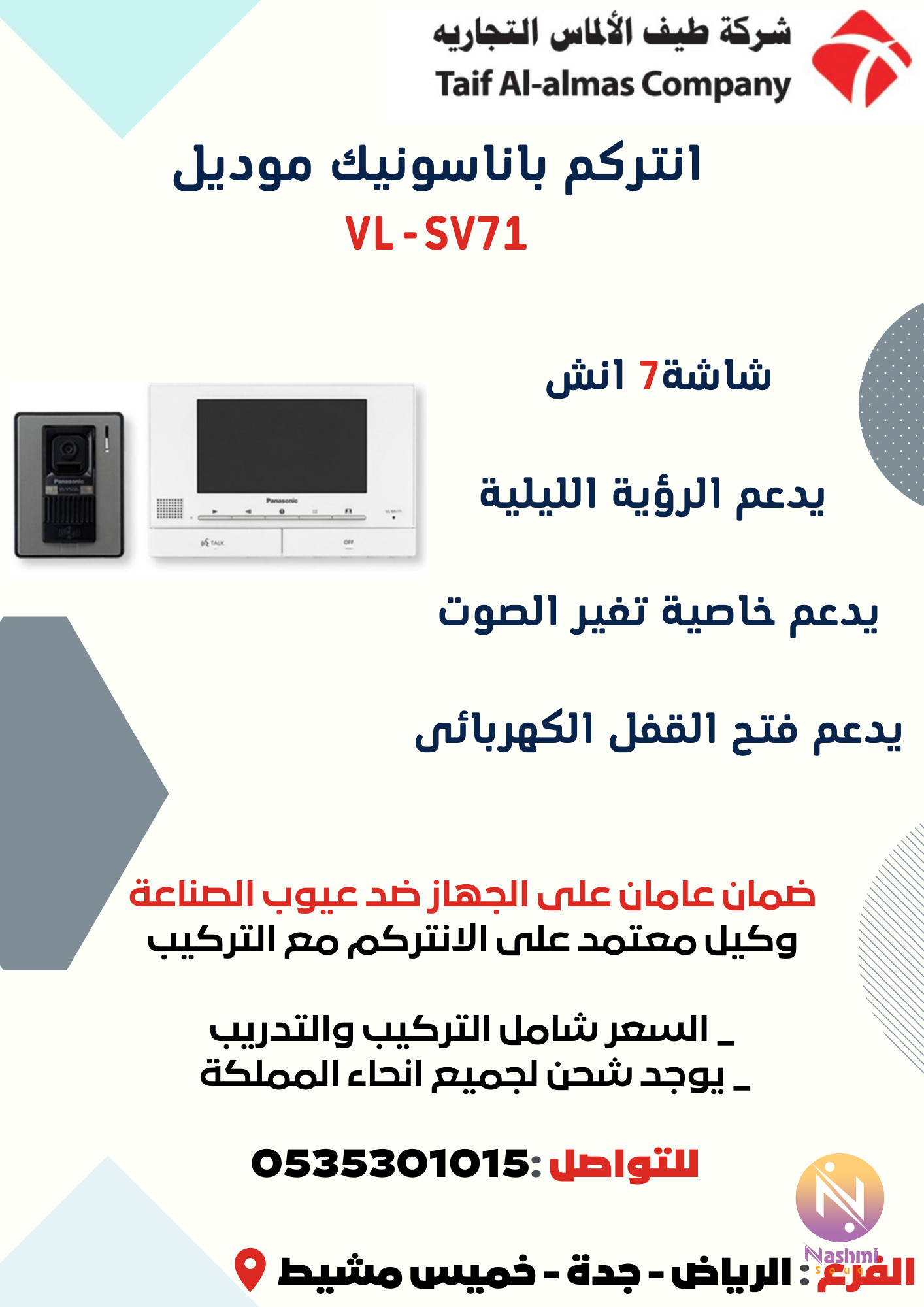 انتركم باناسونيك PANASONIC الهاتف الذكي للاتصال الداخلي بالمنازل موديل VL-SV71 المواصفات : -امكانيه التوصيل بالهواتف الذكيه smart phone . -تمكين تحديد هوية الزائر و المكالمات عبر الهاتف الذكى -الاعلام بالبريد الالكتروني . -شاشه ملونه عريضه بحجم 7 بوصات . -امكانيه تسجيل الصورة. -دعم تحرير القفل الكهربائي . -مغير الصوت . -امكانيه الرؤيه الليليه. ضمان عامان- تدريب وتركيب مجانا وكيل معتمد اتصل الان :0535301015 او من خلال الواتساب :wa.me//966535301015 او يمكنك الطلب من متجرنا :taif-alalmas.odoo.com/shop فروعنا : الرياض - جدة - خميس مشيط يمكن استلام الاجهزة من الافروع او من خلال الشحن الى جميع مدن المملكة