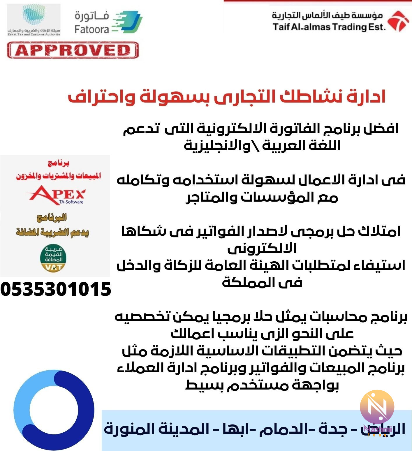 برنامج APEX لإدارة المبيعات والمشتريات والعملاء والموردون ونقاط البيع وادارة المخازن متوافق مع متطلبات هيئة الزكاة والضريبة والجمارك يدعم الفاتورة الالكترونية الخدمات التي يقدمها البرنامج : التعامل مع عدد غير محدد من المخازن . ********************************** -إمكانية تقسيم الأصناف في فئات متجانسة وفقا لأسس متعددة أو حسب الموردين (مجموعات-أنواع موديلات- بلاد المنشأ- مقاسات- ألون) بما يسهل الحصول على تقارير تخص مشتريات كل مورد . -إمكانية إضافة خصائص داخل النظام على الأصناف وربط الأصناف بها وفق متطلبات النشاط . -إمكانية تحديد حد الطلب لكل صنف مع إمكانية تغييره من وقت لآخر طبقا لمتطلبات العمل والتنبيه على الأصناف المنتهي الرصيد . -تقييم المخزون في أي وقت وفقا لأسس مختلفة (سعر شراء-بيع-متوسط). -إمكانية استحداث مستندات مخزنيه جديدة وفق متطلبات العمل وبالتوجيهات المطلوبة هذا بخلاف المستندات الافتراضية للبرنامج (إذن صرف- إذن إضافة-إذن تحويل) بما يعطى مرونة كبيرة للعمل . -تسجيل تاريخي لعمليات الجرد ومطابقتها بالرصيد الدفتري لتحديد انحرافات المخزون مع الاحتفاظ بجميع الجرود كأرشيف للجرد داخل النظام مع إمكانية طباعته بالانحرافات وقيمتها طبقا لأسس التسعير المختلفة . -إمكانية طباعة كافة المستندات المخزنية (إذن الصرف والإضافة )بالشكل المطلوب . المستودعات و المخزون: ********************** - تعدد الوحدات للصنف و أسعار بيع لكل وحدة. - معرفة قيمة البضاعة في المستودعات في إي لحظة. - تقارير إعادة الطلب و انتهاء الصلاحية. - استعمال و متابعة رقم التشغيلة Part No. - التعامل مع الأصناف المجمعة (تجميع صنف ، فك صنف مجمع). - تحويل البضاعة بين المستودعات و مراجعة التحويلات. العملاء و المبيعات: ****************** - متابعة عدد لا نهائي من العملاء و حساباتهم و أرصدتهم. - متابعة رجال البيع و مبيعاتهم و حساب عمولاتهم . - معرفة المبيعات من صنف أو أصناف إلي العميل. - معرفة الأصناف الراكدة و ربحية مبيعات صنف. - نقاط البيع و مبيعات الكاشير و تصميم و طباعة الباركود. الموردون و المشتريات: ********************* - متابعة الموردون و حركة المشتريات بالعملة المحلية و الأجنبية. - مشتريات صنف أو أصناف من مورد. الخزائن و البنوك: ******************* - متابعة حركات الخزائن و البنوك و أرصدتها. - طرق سداد مختلفة (نقدي / الشيكات / تحويلات / الشبكة). - تقرير ضريبة القيمة المضافة ( بالتفصيل والاجمالى ) مميزات عامه للبرنامج : -دعم الاسم العربي والانجليزي للصنف. -دعم الباركود وطباعة باركود للأصناف من خلال البرنامج. -دعم تنبيه حد الطلب عند وصول الصنف لكميه محدده. -دعم اكثر من مستخدم واكثر من جهاز واكثر من فرع. -إعطاء صلاحيات مختلفه لكل مستخدم علي حسب صلاحياته ((صلاحيات للشاشات و صلاحيات العمليات و صلاحيات للمخازن وصلاحيات للمبيعات والمشتريات)) -دعم اكثر من لغه, وجود قاموس خاص بالبرنامج لتسمية الشاشات والقوائم والعمليات كما يريد المستخدم بكل سهوله ويسر. -سهولة البرنامج في التعامل. -دعم أكثر من طريقة دفع لنفس الفاتوره مثل دفع جزء نقدي وجزء بالبطاقه وجزء آجل. -لاتوجد رسوم سنويه مرة واحده فقط البرنامج يتم ترخيصه ترخيص مدى الحياة ( شامل التركيب والتدريب ) للتواصل : الجوال او واتس اب : 0535301015 لطلب نسخة تجريبية ارجوا الاتصال علي الجوال : 0535301015 فروعنا : " الرياض , جدة , ابها "