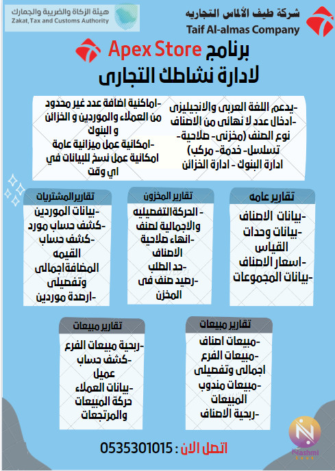 برنامج Apex Store لادارة المخزون والمبيعات والمشتريات برنامج يناسب جميع الانشطة التجارية البقالة الفنادق العطارة الجزارة الخضروات السباكة الكهرباء واخرى يمكن تفعيل البرنامج مخزونى او خدمى او تسلسلى او صلاحية او صنف مركب يدعم البرنامج الفاتورة الالكترونيةQR ومرخص مدى الحياة بدون اى اشتراكات البرنامج تم برمجته من خلال لغه البرمجه #C المدعومه من شركة مايكروسوفت يعمل البرنامج على جميع قواعد البيانات نظام طباعه للفواتير و التقارير مميز و فريد من نوعه يستخدم تكنولجي الFastReport السريعه في الطباعه و التي تسمح بتصميم اي شكل فاتوره او تقرير و تسطيع اضافة اكثر من تصميم للفواتير و التقارير للاستخدام في اي وقت يمكن عمل اكثر من قاعدة بيانات فى تفس الوقت يمكن ربط اكثر من نقضة بيع اضافة عدد لانهائى من المستخدمين والاصناف والوحدات والمجموعات والمخازن والفواتير والموردين والعملاء والخزائن يمكن عمل نسخة احتياطية من البيانات فى اى وقت بسهوله ارسال اشعار لكمية اوشكة على الانتهاء فى المخزن فتح اكثر من نافذة فاتورة مشتريات اقفال السنه المالية بكل سهوله وبساطة وبداية سنه جديدة مع ضمان وكيل معتمد اتصل الان :0535301015 الفرع : الرياض - جدة - خميس مشيط