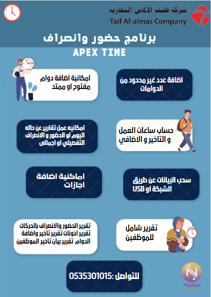 شركة طيف الالماس التجارية : برنامج حضور وانصراف هو برنامج متخصص فى ادارة الحضور والانصراف ومواعيد العمل مميزات البرنامج -سحب البصمات من خلال USB او امكانية لسحب من خلال الشبكة -اضافة عدد غير محدود من الدوامات -امكانية اضافة دوام مفتوح -اماكنية اضافة اجازات -حساب ساعات العمل و التاخير و الاضافي -امكانيه عمل تقارير عن حاله اليوم او الحضور و الانصراف التفصيلي واجمالى -يدعم الدوام الممتد -تقرير الحضور والانصراف بالحركات _تقرير اذونات_تقرير تاخير واضافة الدوام _تقرير بيان تاخير الموظفين -تخزين بيانات الموظفين -تقارير يوميه او اسبوعيه او شهرية -يمكن تحديد مواعيد عمل مؤقته مثل (موعيد عمل شهر رمضان ) -يمكن عمل مواعيد خاصه مثل ( المدورين ) البرناامج يعمل على جميع اجهزة البصمه وكيل معتمد للبرنامج مع ضمان للتواصل والاستفسار :0535301015 الفروع : الرياض - جدة - خميس مشيط