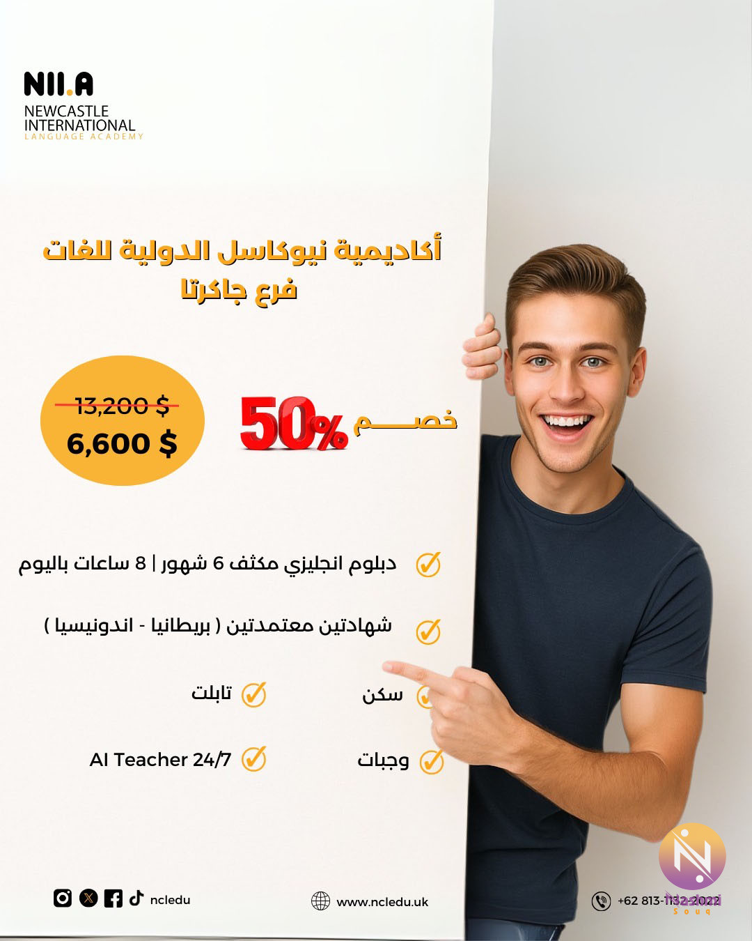 دبلوم اللغة الإنجليزية – فرع جاكرتا أكاديمية نيوكاسل الدولية للغات تعلن عن فتح التسجيل في برنامج الدبلوم المكثف 6 أشهر مع عرض خاص وخصم 50% مميزات البرنامج: • دراسة يومية 8 ساعات مكثفة • شهادتين معتمدتين (بريطانيا + إندونيسيا) • سكن + وجبات + تابلت لكل طالب • متابعة مستمرة عبر معلم ذكي يعمل بالذكاء الاصطناعي 24/7 السعر بعد الخصم: 6,600 دولار فقط للتفاصيل الكاملة والملف التعريفي (pdf) يرجى التواصل معنا عبر الواتساب: 6281311322022