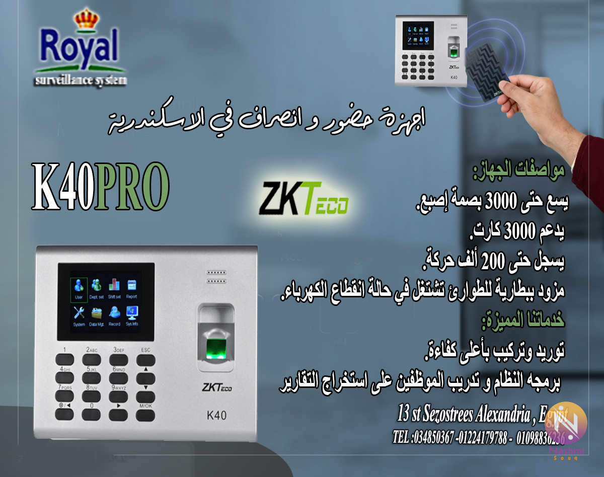 جهاز البصمة ZK-K40 PRO للحضور و الانصراف في الاسكندرية 💥 جهاز البصمة ZK-K40 PRO 💥 👈 الحل الأمثل لتنظيم حضور وانصراف الموظفين بكل سهولة وكفاءة! 🎯 مواصفات الجهاز: ✔️ يسع حتى 3000 بصمة إصبع. ✔️ يدعم 3000 كارت. ✔️ يسجل حتى 200 ألف حركة. ✔️ مزود ببطارية للطوارئ تشتغل في حالة انقطاع الكهرباء. 💼 خدماتنا المميزة: 🔧 توريد وتركيب بأعلى كفاءة. برمجه النظام و تدريب الموظفين على استخراج التقارير 🚚 شحن يومي لجميع المحافظات – مش هنسيبك تستنى! 💠 خدمة ما بعد البيع: ✅ دعم فني على مدار الساعة طوال الأسبوع. ✅ ضمان شامل لمدة سنة كاملة. 🎉 اطلب جهازك دلوقتي واستمتع بأعلى جودة وأفضل خدمة! 034850367 – 01224179788 – 01098836236 Whatsapp link: https://iwtsp.com/201224179788 * الشركة مسجلة ضريبيا و يوجد لدينا سجل تجاري * العنوان 13 st Sezostrees Alexandria Egypt📞 اتصل بنا الآن واحجز جهازك 💪 #zk #ZKTecoProduct
