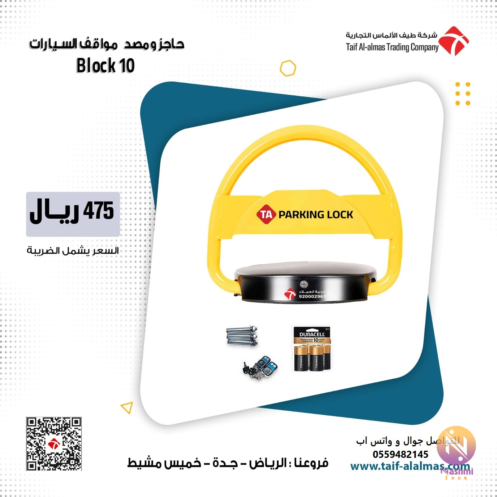 جهاز حاجز ومصد مواقف السيارات احجز مكان سيارات بسعر لا يقبل المنافسة جهاز لحل ازمه المواقف في الشقق والبيوت وحتى الشركات. هذا الجهاز يركب امام الموقف حقك ويمنع اي شخص من الوقوف امامه. له ريموت للفتح والقفل على مسافة 10 متر ميزاته ومواصفاتة:- 1 -مزود بعدد 2 ریموت للتحكم بفتح وغلق الجھاز 2 -یعمل بعدد 4 بطاریات جافھ مقاس D 3 -بطاریات تدوم الي 6 اشھر واكثر 4 -مقاوم للماء وحرارة الشمس 5- 2مفتاح للفك والتركيب 6- ضد الماء والغبار 7- له انذار في حاله التلاعب فيه. 8- قابل للنقل لاي مكان اخر.(فقط فك المسامير وركبه في الموقع الجديد) 9- مصنوع من الحديد القوي وزنه 6 كج تقريبا 10- ارتفاعه 40سم السعر "440 ريال بالضريبه 12- ارتفاعه 45 سم السعر 475 ريال بالضريبه التركيب مجانا فروعنا (الرياض - جده -الخميس مشيط ) كلمات دلاليه مصد حاجز سيارات مصد حاجز مركبات مصد حاجز سيارات مصد حاجز مركبات