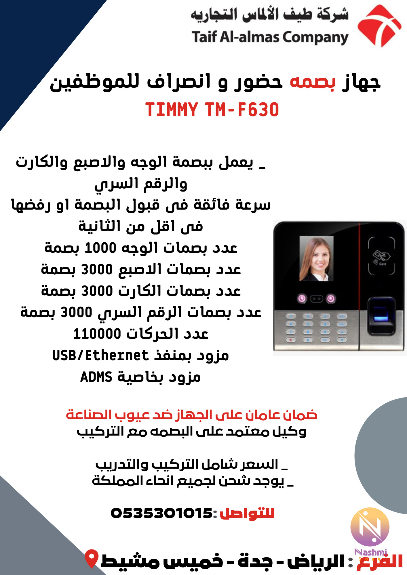 مواصفات الجهاز البصمه TIMY TM-F630 : 1- يعمل ب ( بصمه وجه- بصمه الاصبع- بصمه الكارت-الرقم السري ) 2-عدد بصمات الوجه 1000 بصمه وجه 3- عدد بصمات الاصبع 3000 بصمه 4- بصمات الكارت 3000 بصمه كارت 5- عدد الحركات 110000 حركه 6- مزود بخاصية ADMS 7- مزود بمنفذ USB & Ethernet 8- يدعم التوصيل كا ACCESS CONTROL 9- تشغيل الجهاز باللغة العربية واللغة الانجليزية او اكثر من لغة 10- يمتاز بالتصميم الذي يناسب جميع الاماكن المختلفه 11- التقاط البصمة بسرعة فائقة الرقابة علي الحضور والانصراف لمؤظفين الشركه بفروعها المختلفة "ضمان عامان ضد عيوب الصناعه " "سعر الجهاز 460 ريال بالضريبة " "سعر البرنامج حسب الباقة " فروعنا " الرياض - جده - ابها " للاستفسار والتواصل عن باقي العرض " الجوال او واتس اب : 0535301015"