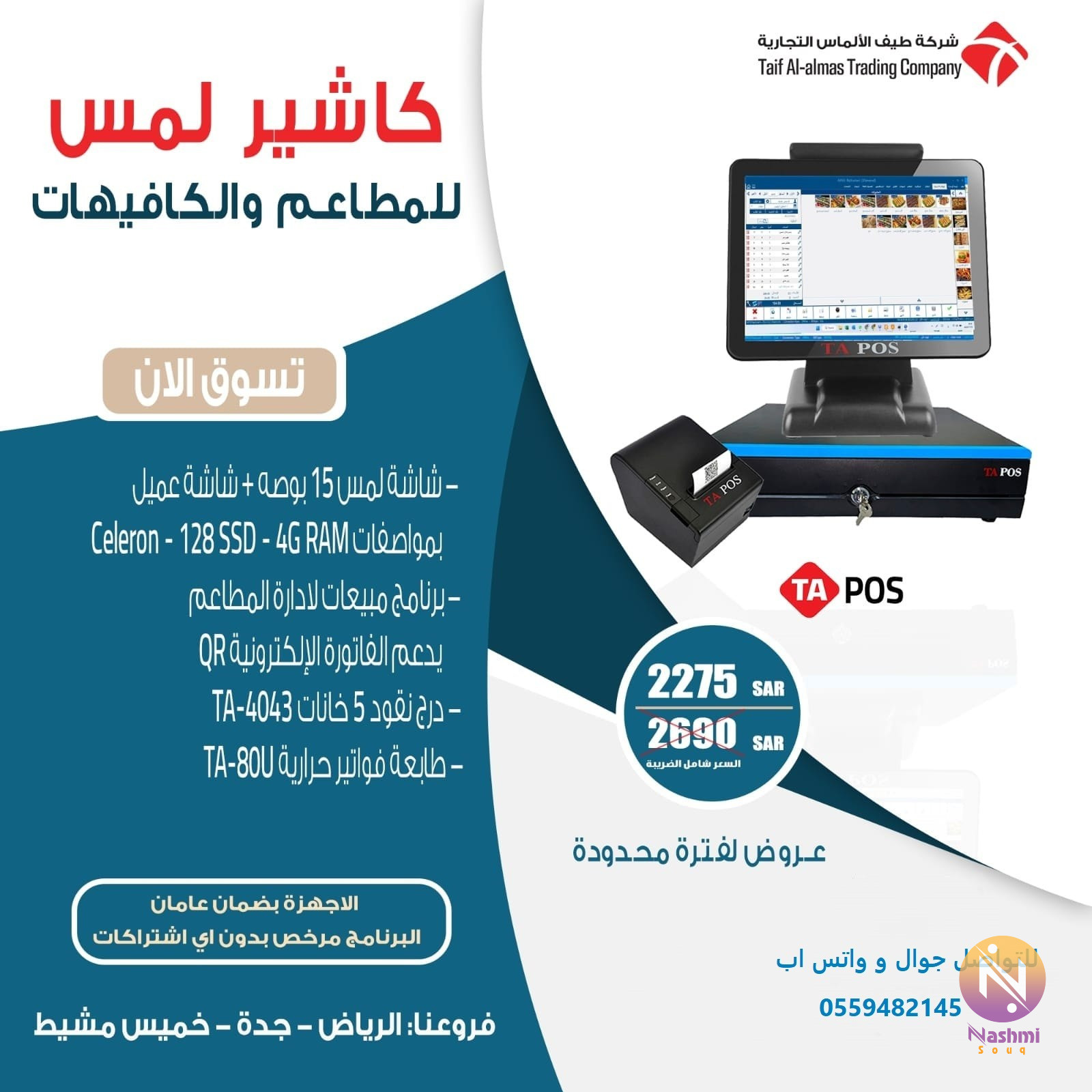 شركه طيف الالماس التجارية للانظمة الامنية تقدم كتالوج المنتجات ( كاميرات مراقبة - سنترالات - كاشير- اكسس كنترول - حضور وانصراف - تتبع - مصد - بوابات - نقاط بيع - انتركم - انذار سرقات ) ●برامج نقاط البيع - أنظمة ال POS - برنامج مبيعات ========================== يساعدك برنامج مبيعات Apex Store فى ادارة عمليات البيع وطباعة الفواتير داخل نشاطك التجارى سواء كان محل أو معرض أو مخزن أو شركة تجارية او موزع تجارى. يعتبر أفضل نظام إدارى محاسبى يشمل إدارة نقاط البيع والكاشير وادارة المبيعات و المشتريات والحسابات والمخازن والتقارير. ●اقوى العروض على نقاط البيع التاتش والكمبيوتر بضمان عامان ============================== العرض الاول نقاط بيع تعمل باللمس تاتش مطاعم وكوفى شوب Point Of Sale J3710-128SSD-4GRAM -جهاز تاتش اسكرين 15 انش +شاشه عميل -برنامج المطاعم والكوفى شوب -درج الكاشير الالكترونى - طابعه الفواتير السعر 2275 ● فروعنا -الرياض - جدة-الخميس مشيط -جميع الاجهزة بضمان عامان للتواصل جوال و واتس اب0559482145 يرجى الاطلاع على الصور