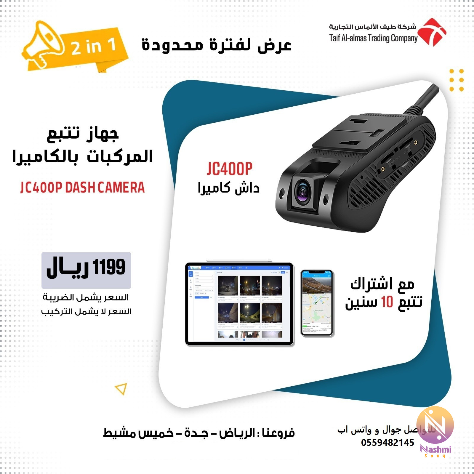 جهاز تتبع السيارات مع كاميرا JC400P *تستطيع رؤية الافراد في داخل السيارة مباشرة والتحدث معهم لانها تتميز بكاميرا فيديو مباشر مميزات كاميرا مراقبة السيارات JC400P : 1-تصوير امامي وداخلي حيث تستطيع رؤية الطريق امام السيارة ورؤية الركاب داخل السيارة أيضا. 2-متابعة مباشرة لتصوير الكاميرا حيث تستطيع بكل بساطة فتح تطبيق المراقبة ورؤية فديو مباشر لداخل السيارة. 3-خاصية التحدث مع الركاب حيث تستطيع التحدث مع السائق وسماعه ايضا( الكاميرا بها مايكروفون وسماعات) 4-خاصية التتبع GPS لمتابعة موقع السيارة لحظيا على الخريطة وحفظ وتسجيل جميع المسارات السابقة 5-خاصية بث الواي فاي داخل المركبة: حيث تعمل الكاميرا ك راوتر في السيارة ويستطيع الراكب الاتصال بالانترنت من خلالها 6-تنبيه القيادة المتهورة مثل التنبيه عند التسارع المفاجئ للمركبة، استخدام الفرامل المفاجئ او الانعطاف الحاد. 7-تنبيه الاهتزاز في حال كانت السيارة مطفئة وحدث اهتزاز, سيأتيك تنبيه على جوالك وستبدأ الكاميرا بالتسجيل. 8-خاصية الرؤية الليلية للتصوير داخل السيارة حتى وان كانت الاضاءة منخفضة المواصفات: الكاميرا تدعم شبكة 3G , 4G 1-دقة الكاميرا الأمامية: FHD 1080P 2-دقة الكاميرا الداخلية: FHD 720P مع ميزة الرؤية الليلة. فروعنا الرياض- جده - الخميس مشيط للتواصل جوال و واتس ابwa.me//966559482145