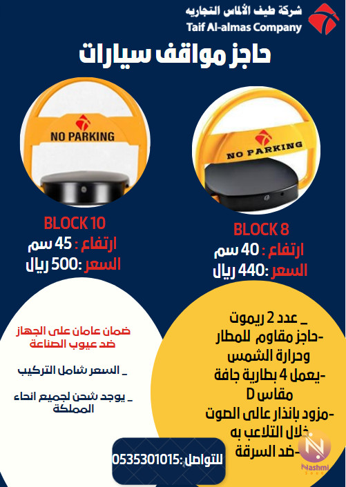 شركة طيف الالماس التجارية : مصد مواقف سيارات حل ازمات المواقف ف البيوت والشركات والمصانع مكونات الجهاز 2 ريموت كنترول 3 مسمار لتثبيت الحاجز بطاريات -ضد السرقه -مقاوم لعوامل الجو (الشمس - الحرارة المرتفعة - الامطار - الاتربه ) -مصنوع من معدن شديد الصلابة -مزود بانذار حال التلاعب به -قابل للنقل لاي مكان اخر الانواع المتوفرة : _ BLOCK 8 ارتفاع : 40 سم السعر :440 ريال BLOCK 10 ارتفاع : 45 سم السعر :500 ريال الاسعار شامله الضريبة والتركيب مجانا يوجد اسعار خاصة ( جمله ) ضمان عامان ضد عيوب الصناعة وكيل معتمد الفرع : الرياض - جدة - خميس مشيط يوجد شحن لجميع انحاء المملكة