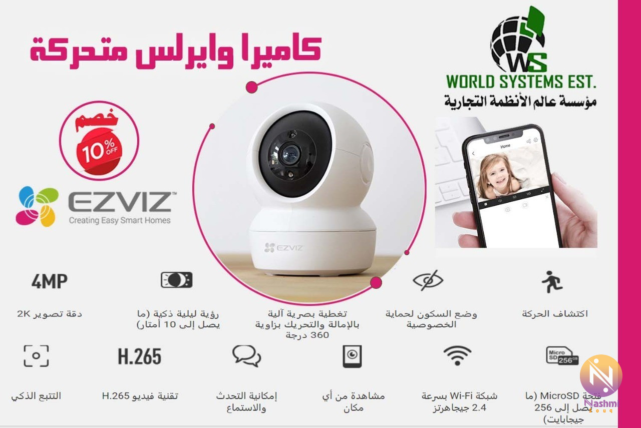 كاميرا وايرلس متحركه - كاميرا ذكية قابلة للإمالة والتحريك تتصل بشبكة Wi-Fi راقب مساحتك بالكامل بسهولة مع كاميرا C6N التي تتمتع بمجال رؤية بزاوية 360 درجة، وبميزة التتبع الذكي. كاميرا تقوم بحمايتك - بالليل والنهار. 2- تسجيل كل زاوية بدقة 2K. تسجل هذه الكاميرا القوية بدقة 2K، فتظهر التفاصيل بوضوح حتى مع التكبير الرقمي إلى 4 أضعاف، بحيث يمكنك رؤية كل شيء بوضوح في الفيديو المباشر وعند التشغيل. 3- لا توجد أماكن محجوبة. يمكنك مراقبة كل ركن باستخدام كاميرا C6N واحدة فقط. ويضمن مجال الرؤية الواسع بزاوية 360 درجة تغطية كاملة، بحيث لا يفوتك أي شيء 4- التتبع الذكي. تتميز كاميرا C6N بدرجة كافية من الذكاء تجعلها عندما تكتشف جسمًا متحركًا تتبع حركته تلقائيًّا مع تنبيهك بصورة في الوقت الفعلي. 5- إمكانية اتصال، في أي وقت. تحدث إلى أحبائك وامنع الغرباء غير المرغوب فيهم – كل ذلك باستخدام ميزة الاتصال ثنائي الاتجاه بكاميرا C6N. ويمكنك باستخدام تطبيق EZVIZ على جهازك الجوال الاستمتاع بالاتصال بكل سهولة وراحة حيثما كنت. 6- تمكَّن من الرؤية بشكل أوضح في الظلام. تمتع بحماية على مدار الساعة مع كاميرا C6N. بفضل مصابيح LED القوية التي تعمل بالأشعة تحت الحمراء، فإنها تتيح لك مجال رؤية يصل إلى 10 أمتار في الإضاءة الخافتة. 7- نوفر الحماية لبياناتك وخصوصيتك. ونضع حماية بياناتك وخصوصيتك على رأس أولوياتنا. يتم تشفير نقل البيانات بين الكاميرا وسحابة EZVIZ من البداية إلى النهاية. أنت فقط من يملك مفاتيح فك تشفير بياناتك. للحصول على طبقة إضافية من حماية الخصوصية، يمكنك دائمًا تفعيل وضع السكون بالكاميرا على تطبيق EZVIZ. 8- وفِّر المال المهدر في تخزين الفيديو والنطاق الترددي. تتميز الكاميرا بتقنية ضغط الفيديو المتقدمة H.265، ما يحقق جودة فيديو أفضل عن طريق نصف النطاق الترددي فقط ونصف مساحة التخزين المطلوبين لمعيار ضغط الفيديو السابق H.264. # كاميرا وايرلس # كاميرا لا سلكي # كاميرا متحركة # كاميرا صوت وصورة # كاميرا واي فاي # كاميرا wifi # كاميرا عن طريق الجوال # كاميرات مراقبة