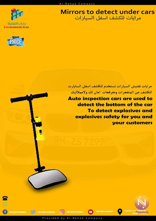 نقدم لكم وبسعر مناسب كاميرا كشف وفحص أسفل السيارة، للكشف عن الأسلحة والمتفجرات والمخدرات، وهي سهلة الفك والتركيب، وتستخدم في المولات ونقاط التفتيش والشركات، ويوجد لدينا أيضا المصدات والحواجز الأمنية والشوكية وبوابات دخول وخروج السيارات.فروعنا بالمملكة:جدةـالخبر،قصيم،الرياض..ولنا فروع في البحرين. للتواصل عبر الواتساب:0598589293