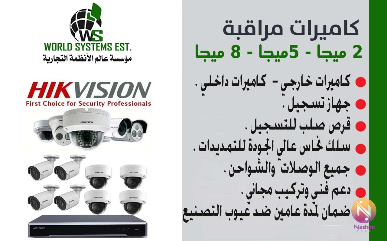 الان من مؤسسة عالم الانظمة التجارية كاميرات مراقبة بأحدث التقنيات توريد – تركيب – صيانة كاميرات حتى 8 ميجا بجودة الـ 4k كاميرات خارجية وداخلية ومتحركة IP - analog – wireless اجهزة تسجيل DVR - NVR قرص صلب حتى 16 تيرا جميع الوصلات والشواحن فريق كامل من الفنيين والمهندسين المهرة دعم فني مجانا لمدة عام عن طريق الهاتف ضمان لمدة عامان ضد عيوب الصناعة