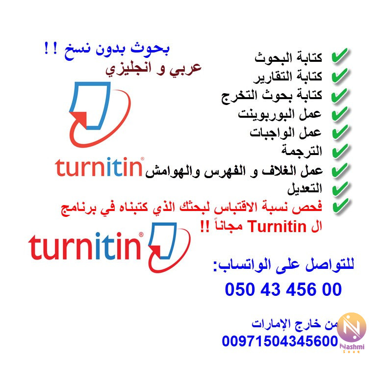 كادر متدرب و متخصص لكتابة البحوث الجامعية و التقارير و بحوث التخرج و البوربوينت ، نقوم بعمل الكيس ستدي ، نقوم بعمل بحوث التخرج مع تنسيق الهوامش والفهرس ، كتابتنا بدون نسبة اقتباس ، المراجع نكتبها بشكل أكاديمي ، خبرة أكثر من 6 سنوات في عمل البحوث بالعربي و بالانجليزي و نقوم بالتعليق على أحكام قضائية و حل قضايا و مسائل قانونية و عمل مشاريع تخصصات الإعلام و العلاقات العامة و علم الاجتماع و أغلب التخصصات الأدبية و العلمية سيكون التواصل على الواتساب على رقمنا التالي: 00971504345600 من داخل الإمارات ( دبي ) 0504345600