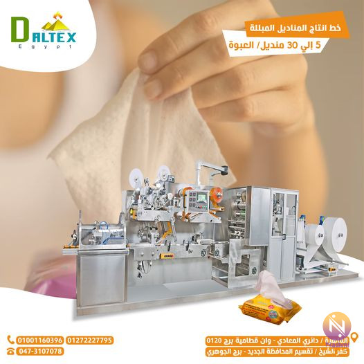 🧼✨ ماكينة تصنيع المناديل المبللة (Wipes) من شركة دالتكس إيجيبت ابدأ مشروعك المربح بخط إنتاج عملي ومضمون! فكرة عمل الماكينة بسيطة وفعّالة: 🔧 بتركب رول الورق الخام (ألياف سليلوز عالية الامتصاص) أسفل الماكينة ✂️ بيتم التقطيع تلقائيًا حسب المقاس المطلوب 🌸 بعدها تمر المناديل على أحواض خاصة بالمادة المعطرة – بدون كحول، فقط عطر خام مذاب في الماء 📦 وفي نفس الخط، تتم التعبئة تلقائيًا وباحترافية ✅ كل ده في ماكينة واحدة! مصممة لتكون سهلة الاستخدام وعالية الكفاءة 📞 للتواصل مع شركة دالتكس إيجيبت: 002-01001160396 002-01272227795 002-047-3107078 🌐 موقعنا الإلكتروني: https://daltexeg.com/ 📱 صفحتنا على فيسبوك: https://www.facebook.com/elgoharry/ 📍 عناوين الشركة – جمهورية مصر العربية: القاهرة – دائري المعادي، وان قطامية، برج O207، الدور الأول، شقة 105 كفر الشيخ – تقسيم المحافظة الجديد (خلف سيراميكا رويال)، برج الجوهري