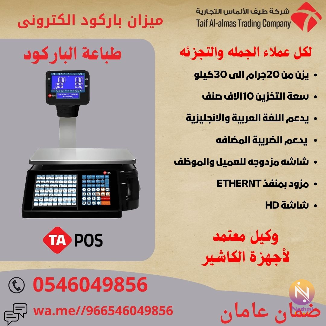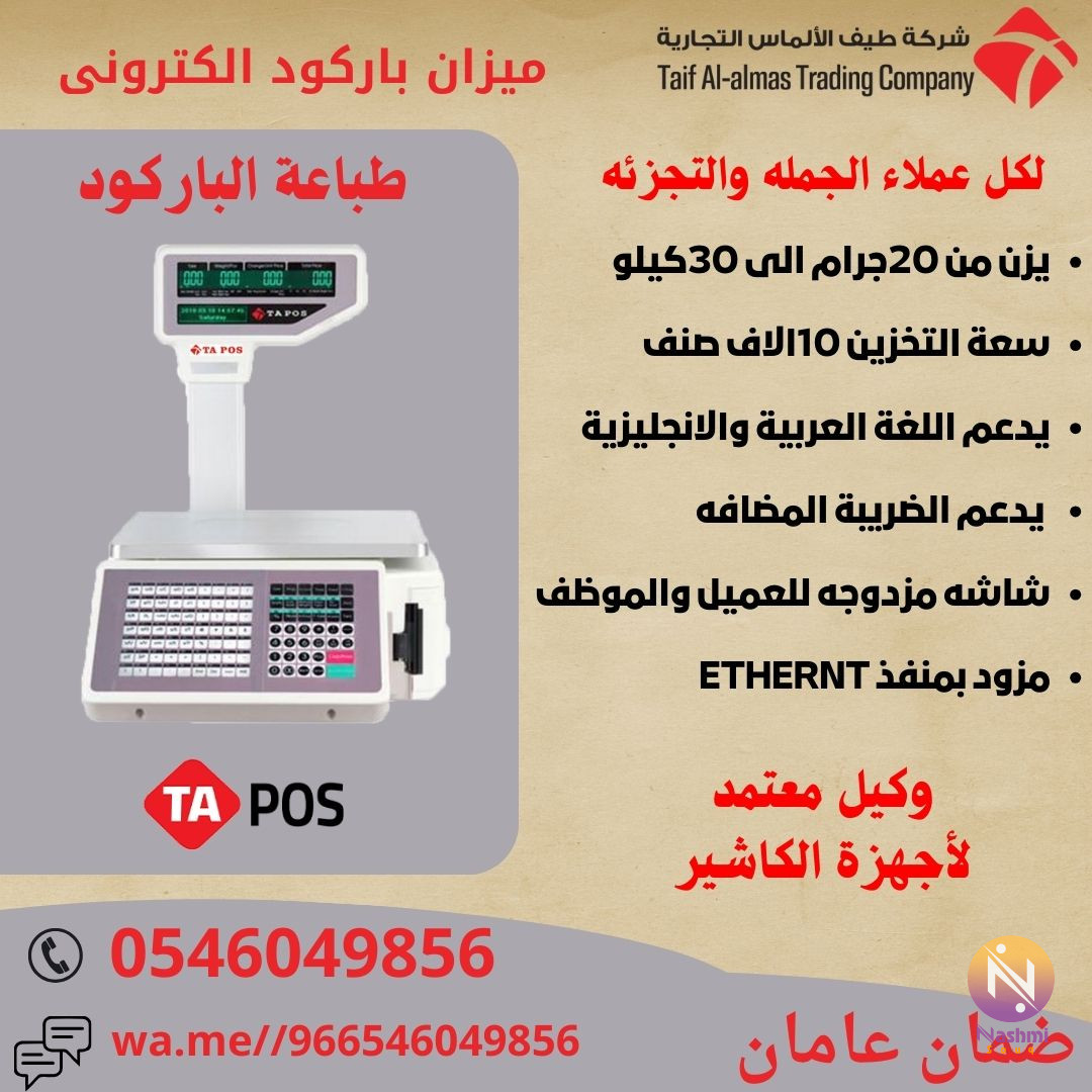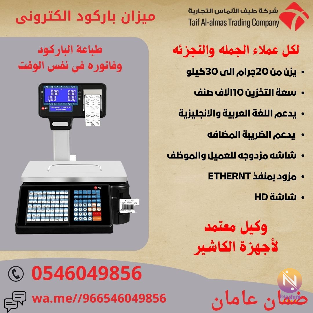موازين باركود موازين كاشير ميزان الكترونى. نظرا للتغير اليومى السريع فى الاسعار وصعوبة التعامل مع طباعة باركود الاصناف خاصة الموزون منها لابد من وجود ميزان الباركود لتلك الاصناف توفيرا للوقت والمجهود عند طباعة الباركود نقدم الى كل عملائنا الكرام بالمملكة العربية السعودية افضل وارخص موازين الباركود الالكترونية بأسعار تنافسية مع الضمان لعامان منتج مميز لاصحاب ومديري المحلات التجارية والسوبر ماركت ومحلات الحلويات والمخابز ومحلات الخضروات واللحوم ميزان باركود الكتروني يقوم بالوزن وطباعة الوزن والسعر علي ورقة باركود حتي 30 كجم الميزان الالكتروني. ●مميزات ميزان الباركود الالكترونى -عربى انجليزى -امكانية تخزين حتى 10,000 صنف. -طباعة واضحة لاستيكر الباركود الحرارى -تستطيع تصفير الميزان عند وضع اى شيء عليه لا ترغب فى حسابة أو عند حدوث خطاء -ارقام الكاتبة كاملة من 1 : 9 -قدرة الوزن حتى 30 كيلو -سهولة فى تعديل سعر المنتج من قبل البائع لعدم توقف العمل اذا لم يتواجد المخول عن بالتعديل. -شاشة LCD لعرض اسم الصنف والسعر والوزن . -منفذ ايثرنت للشبكة -توصيل الميزان الالكتروني علي جهاز الكمبيوتر . -برنامج خاص بالميزان الالكتروني للتحكم في الميزان والاصناف وخصائص الجهاز ● فروعنا: -الرياض-جده-خميس مشيط-المدينة المنورة-تبوك -ضمان عامان على جميع المنتجات -فريق محترف للتركيب والبرمجة -خدمة دعم فنى بعد البيع ● الجوال :(0546049856) ● واتساب :wa.me//966546049856# #ميزان_باركود_الكتروني #الميزان_الالكتروني #ربط_ميزان_بالكمبيوتر #برمجة_ميزان_الباركود #انواع_ميزان_باركود #كيفية_برمجة_ميزان_الكتروني #ضبط_الميزان #اكواد_معايرة_الموازين #ميزان_الكتروني #ميزان_الكتروني_للمحلات #ميزان_ديجيتال #ميزان_باركود #برمجة_ميزان_الكتروني #كيفية_أستعمال_الميزان_الالكتروني