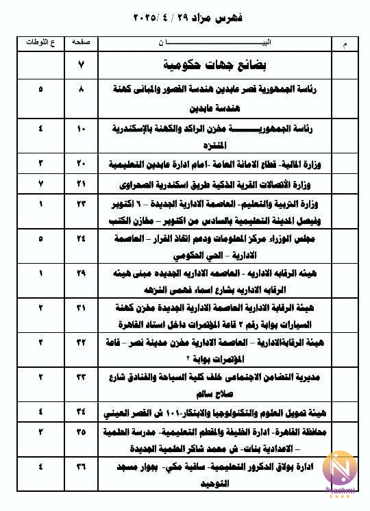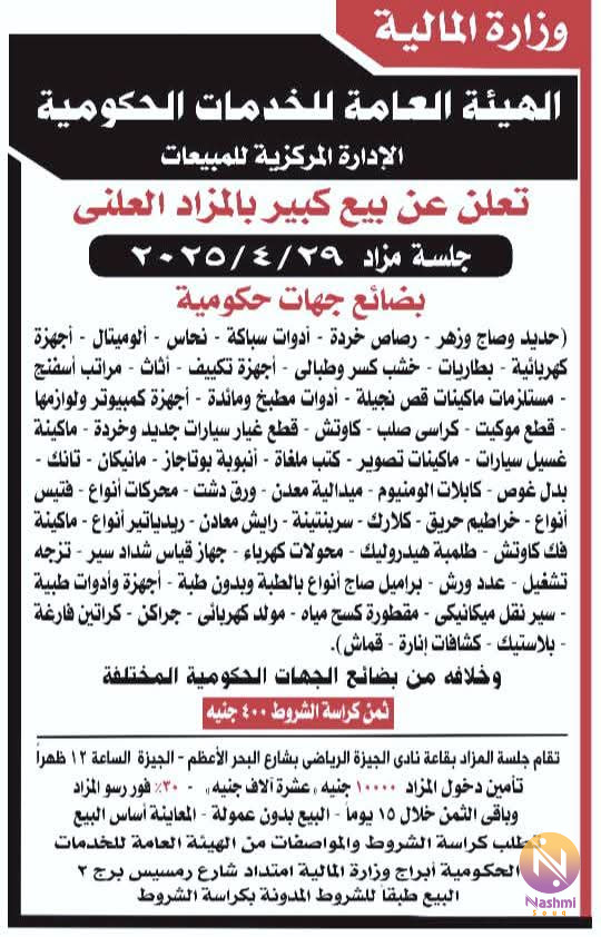 اعلان وفهرس جهات مزاد علنى يوم ٢٩ / ٤ / ٢٠٢٥ لبيع بضائع جهات حكومية بمحافظات القاهرة الجيزه الشرقيه الاسكندريه دمياط السويس جنوب وشمال سيناء و الوادى الجديد #مزادات_سوق_نشمي #اعلانات_مجانيه