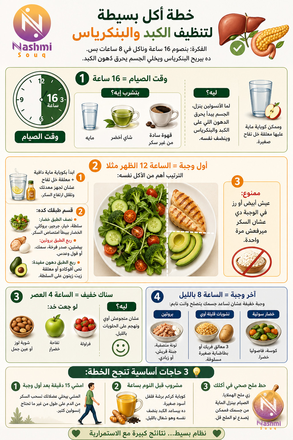 خطة أكل بسيطة لتنظيف الكبد والبنكرياس الفكرة: بنصوم 16 ساعة وناكل في 8 ساعات بس. ده بيريح البنكرياس ويخلي الجسم يحرق دهون الكبد. 1️⃣ وقت الصيام = 16 ساعة بتشرب إيه؟ مويه، شاي أخضر، قهوة سادة من غير سكر. وممكن كوباية مويه عليها معلقة خل تفاح صغيرة. ليه؟ لما الأنسولين ينزل، الجسم يبدأ يحرق الدهون اللي على الكبد والبنكرياس وينضف نفسه. 2️⃣ أول وجبة = الساعة 12 الظهر مثلاً الترتيب أهم من الأكل نفسه: 1. ابدأ بكوباية مويه دافية + معلقة خل تفاح عشان تجهز معدتك وتقلل ارتفاع السكر. 2. قسم طبقك 👇 نص الطبق خضار: سلطة، خيار، جرجير، بروكلي. الخضار بيبطّأ امتصاص السكر. ربع الطبق بروتين: بيضتين، صدر فرخة، سمك، أو فول وعدس. ربع الطبق دهون مفيدة: نص أفوكادو أو معلقة زيت زيتون على السلطة. 3. ممنوع: عيش أبيض أو رز في الوجبة دي عشان السكر ميرفعش مرة واحدة. 3️⃣ سناك خفيف = الساعة 4 العصر لو جعت خد: شوية لوز أو عين جمل، أو تفاحة خضرا، أو فراولة. ليه؟ عشان متجوعش جامد وتهجم على الحلويات بالليل. 4️⃣ آخر وجبة = الساعة 8 بالليل وجبة خفيفة عشان تساعد جسمك يتصلح وانت نايم: بروتين: تونة متصفية، جبنة فلمنك او جبنه شيدر، أو زبادي. نشويات قليلة هتكون: 3 معالق فريك أو شوفان .حبة بطاطس صغيرة مسلوقة.او مشويه خضار سوتية: كوسة، فاصوليا خضرا. 💡 3 حاجات أساسية تنجح الخطة: 1. امشي 15 دقيقة بعد أول وجبة: المشي بيخلي عضلاتك تسحب السكر من الدم على طول من غير ما تحتاج إنسولين كتير. 2. مشروب قبل النوم بساعة: كوباية قرفه أو كوبايةكركم برشة فلفل أسود صغيرة. هذا بيساعد الكبد ينضف نفسه وهو شغال بالليل. 3. حط ملح صحي في أكلك: زي ملح الهملايا علشان. الصيام بينزل الماية من جسمك فممكن تصدع لو الملح قل.. 🙏لا تنسونا من صالح الدعاء ❤️