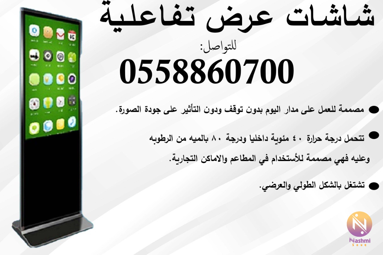 شاشات التفاعل الالكترونى تعتبر شاشات التفاعل الاكتروني من اهم وسائل العرض الخديثة اذا انها تقوم بعرض الماده المختاره عن طريق usb يوجد أحجام مختلفة من الشاشات لتلبية جميع الاغراض الشاشات تعمل بنظام الأندرويد أو الويندوز يوجد بها ريموت للتحكم عن بعد ويمكن توصيلها بالشبكة العنكبوتية ( الأنترنت ) بسهولة تصلخ شاشات العرض التفاعليه للاستخدام الفنادق لعرض ماده دعائية المراكز التعليميه والجامعات المعارض والمولات الكبيره الخ والعديد من الأنشطة الأخرى فروعنا : ( جده - الرياض - القصيم -خميس مشيط - الخبر ) ودولة البحرين للطلب والمراسلة ت/ واتس 0558860700